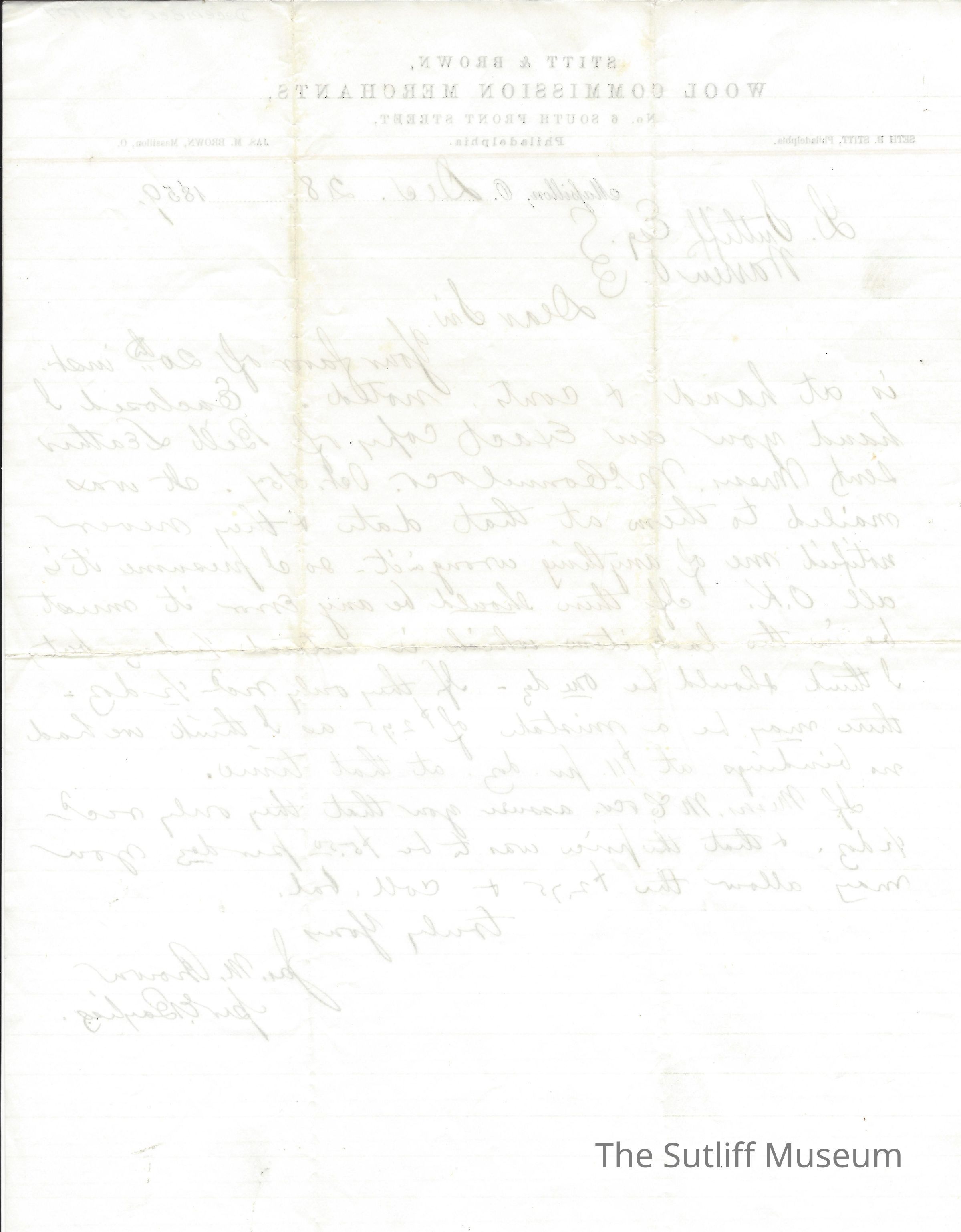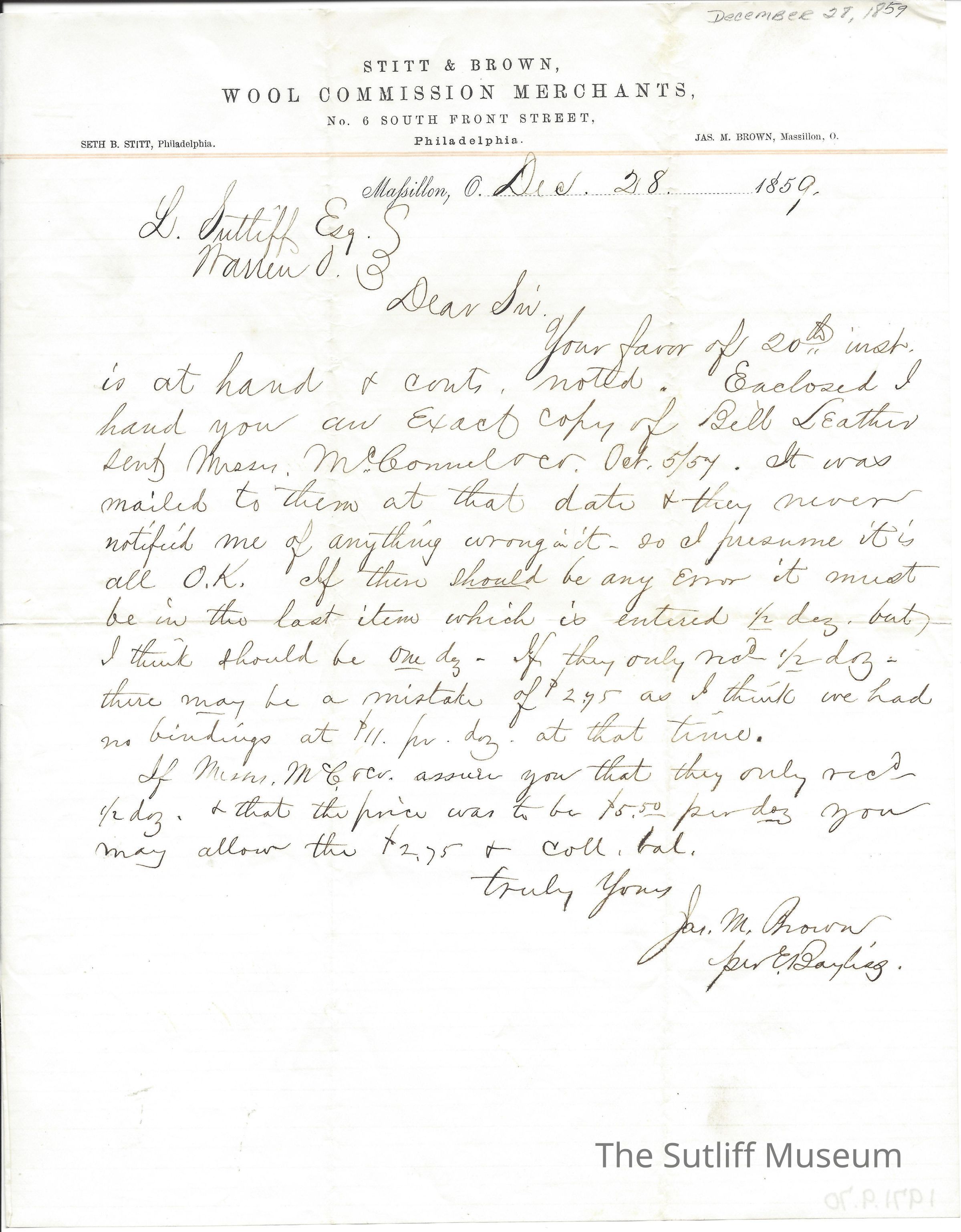 A letter from James M. Brown to Levi Sutliff regarding a copy of another document and a small issue in pricing.Collection