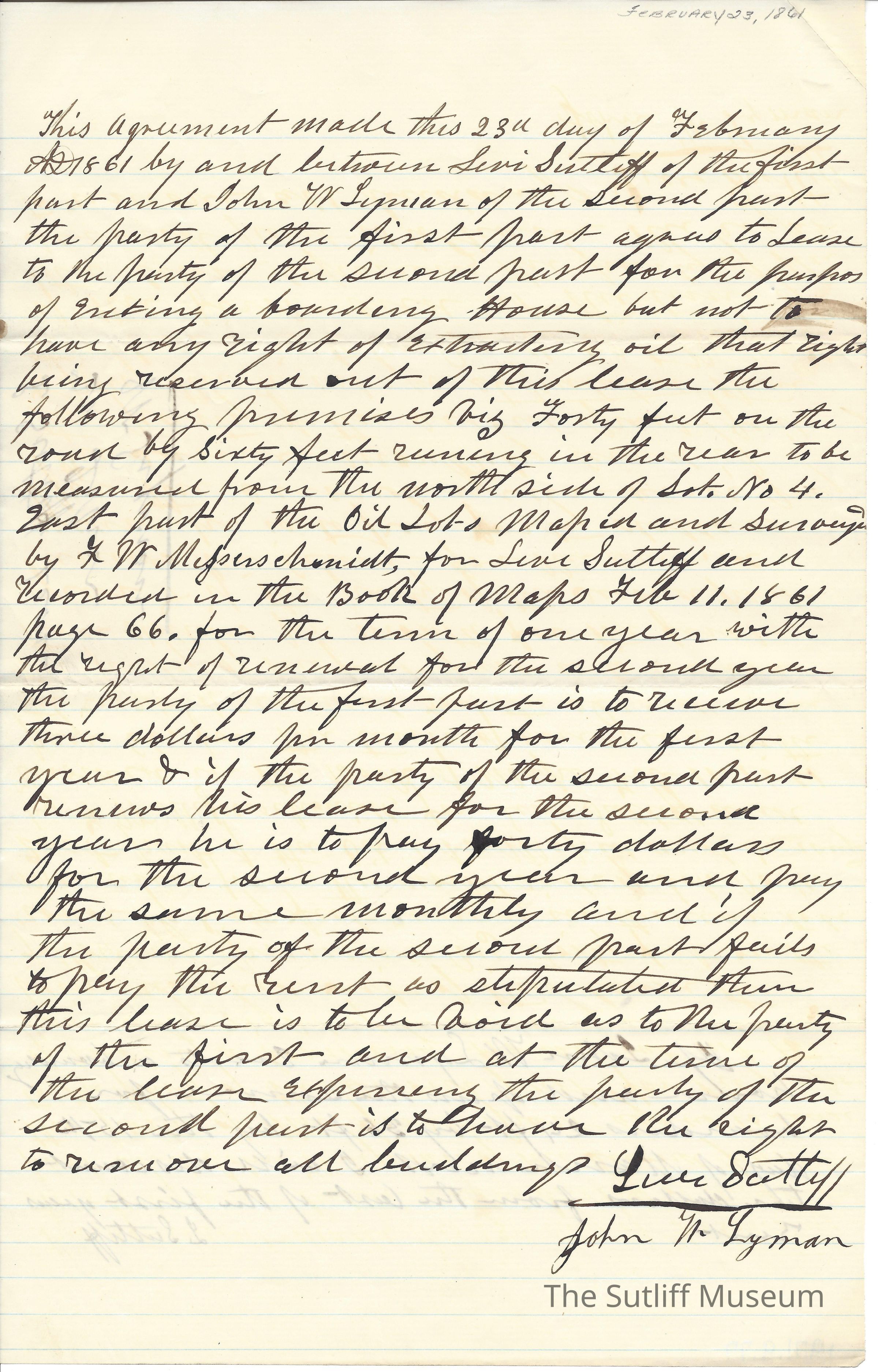 An agreement between Levi Sutliff and John W. Lyman regarding a lease to land to build a boarding house and payment.Collection