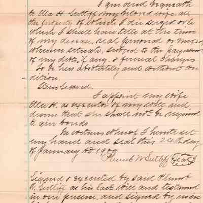 A written final will and testament written by Plumb W. Sutliff on January 24, 1900.Relationships