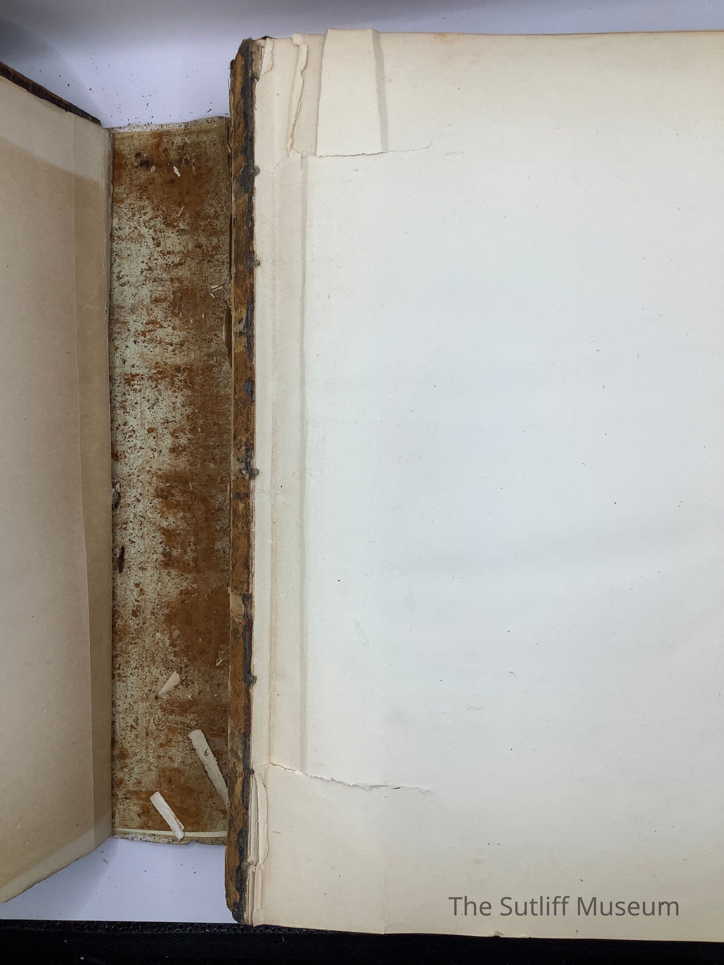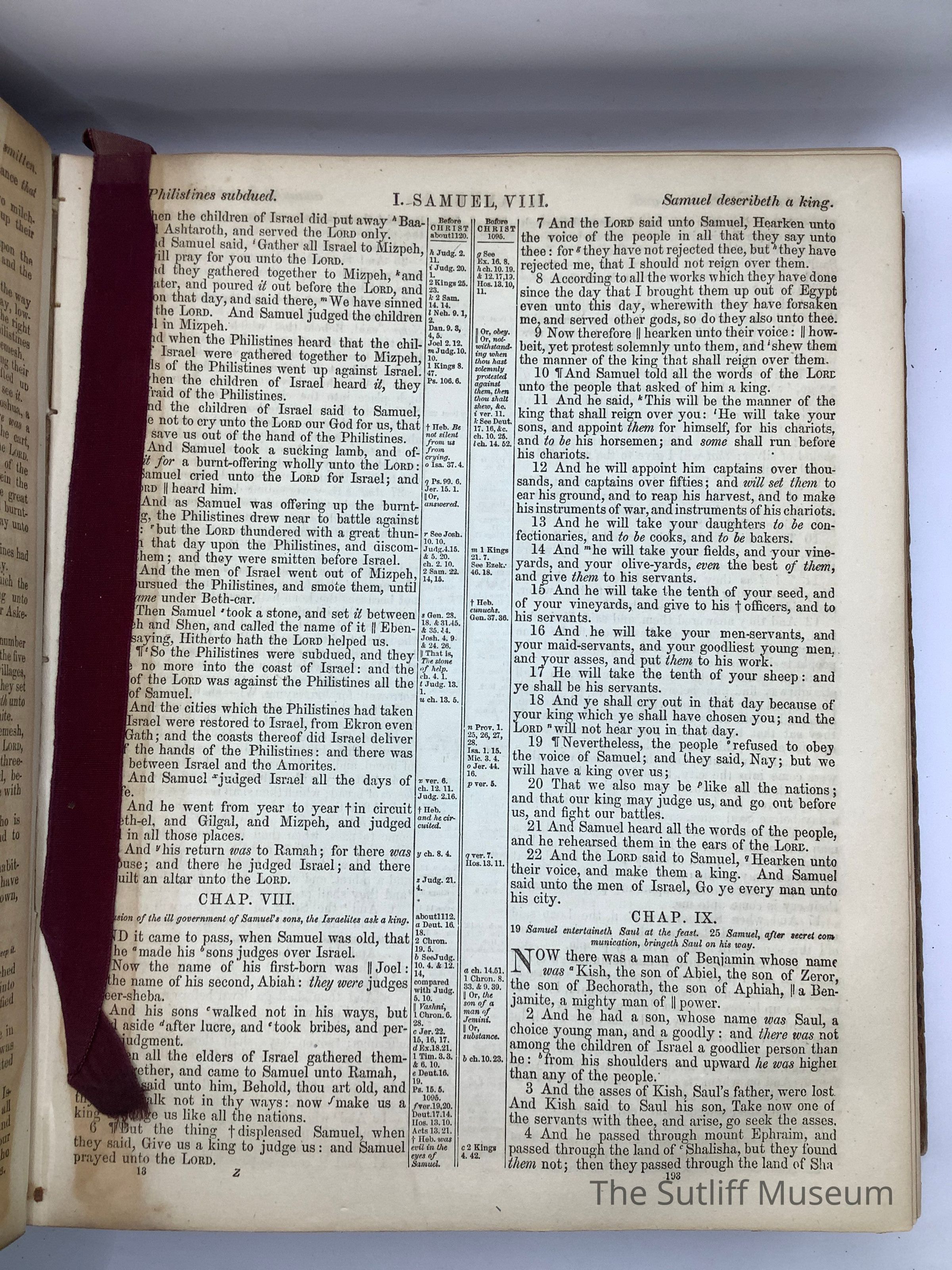 Tooled leather covers with damaged/repaired spine black tape. Front cover has gold embossed image of Jesus in oval with the words "Search the Scripture" arched over and "Thy Word is Truth" under. Image in oval on rear cover is of the young shepherd and lamb. Handwritten on second page in front "Mrs. Phebe L. Marvin Sutliff Warren, Ohio July 1st 1876. Birth, Death, and Marriage information written inside between Old and New Testaments. Gold leaf on page edges.Collection
