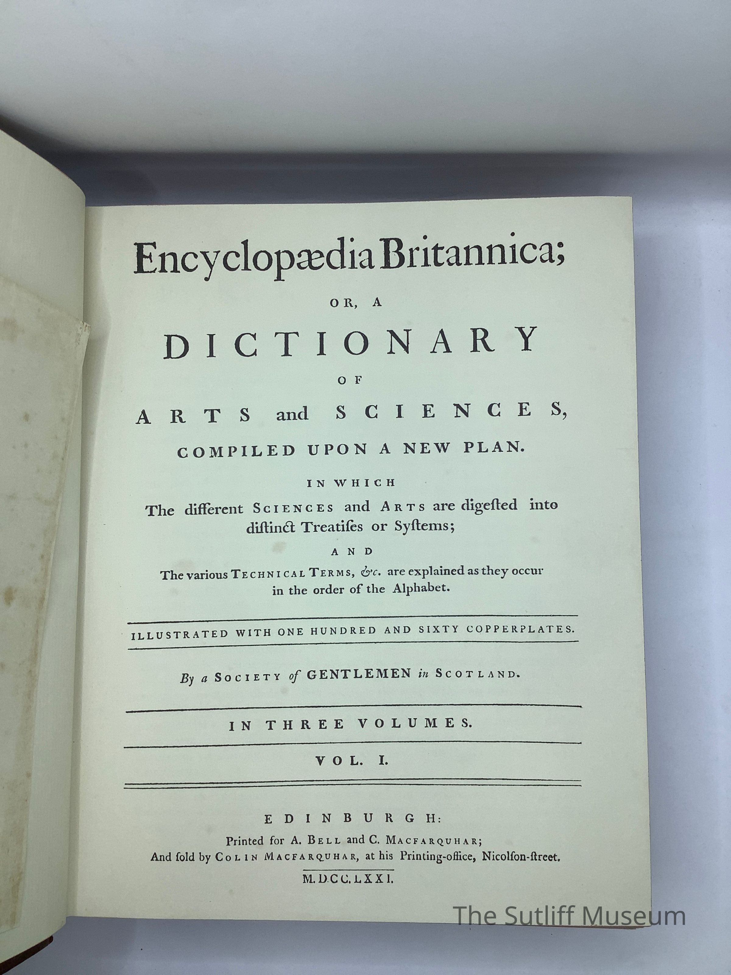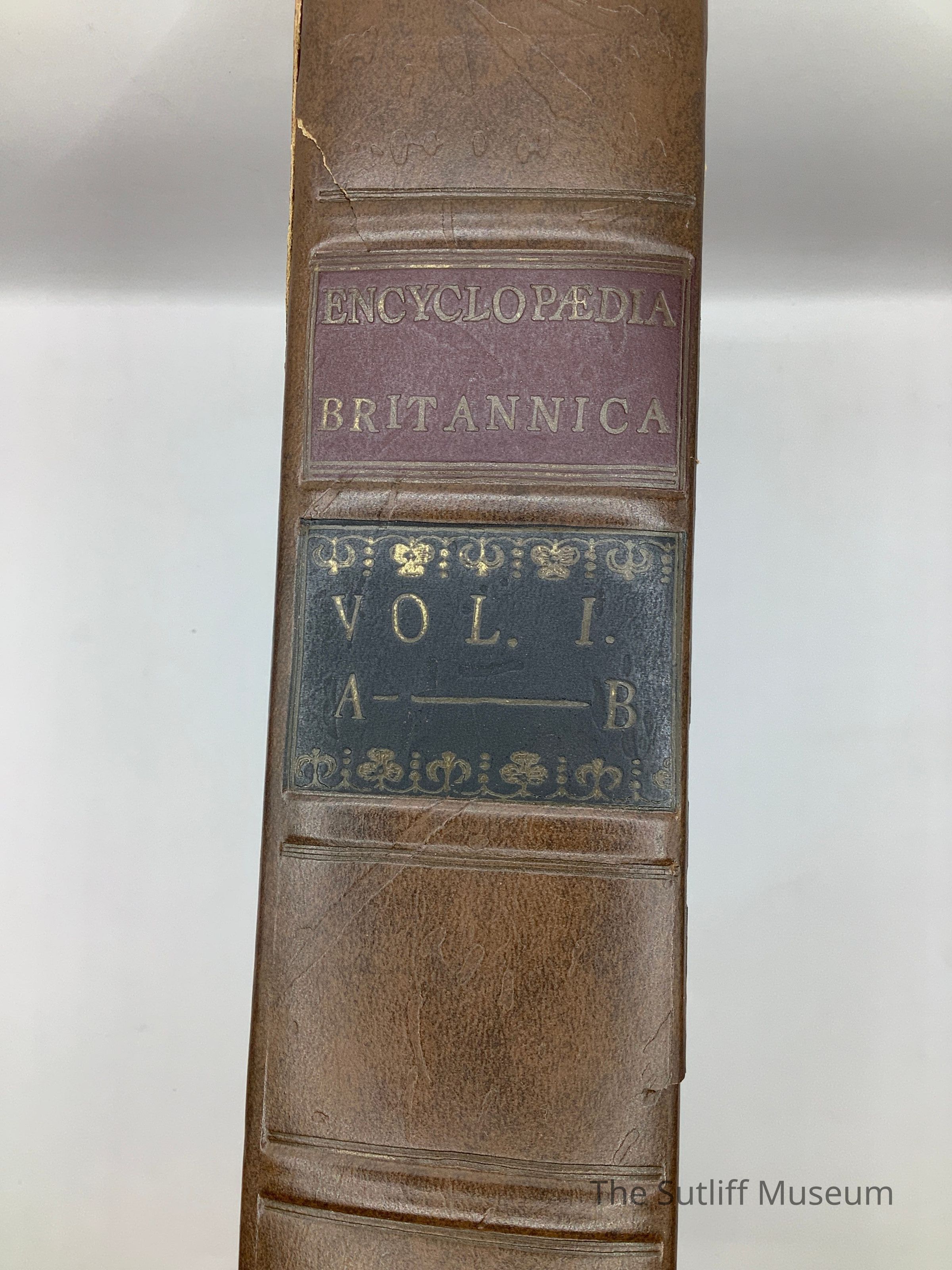 Leather bound Volume I A-B, of a set of three reproduction of 1st edition of Encyclopedia Brittanica 1768-1771. The three volumes are in a cardboard holder. This set was a reproduction to commemorate the 200th anniversary of original work.