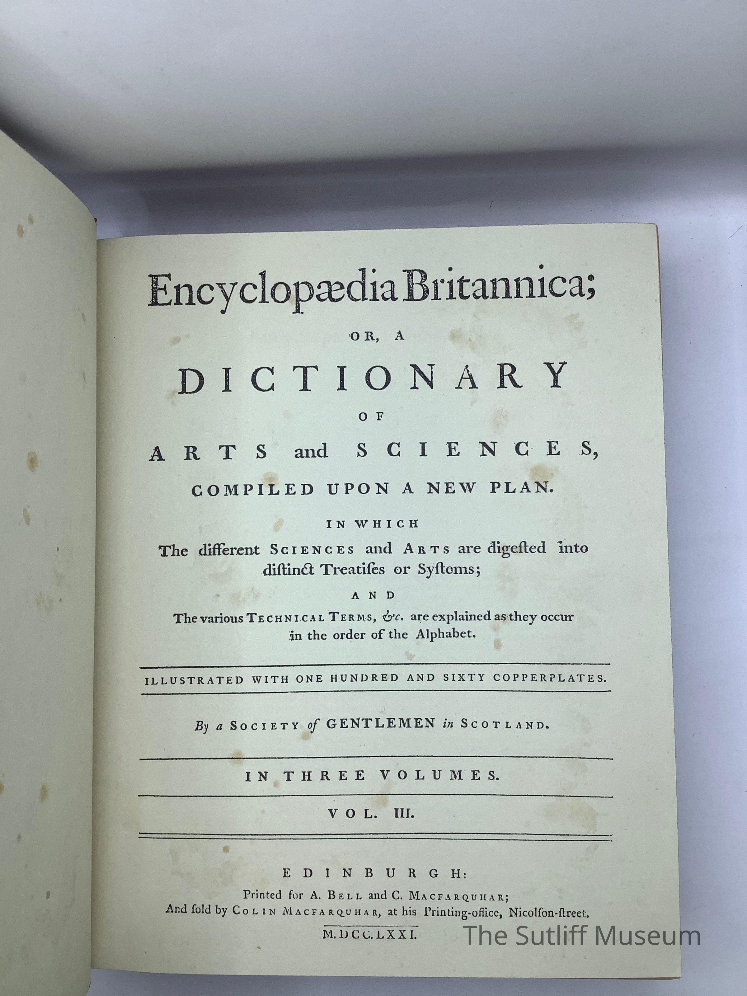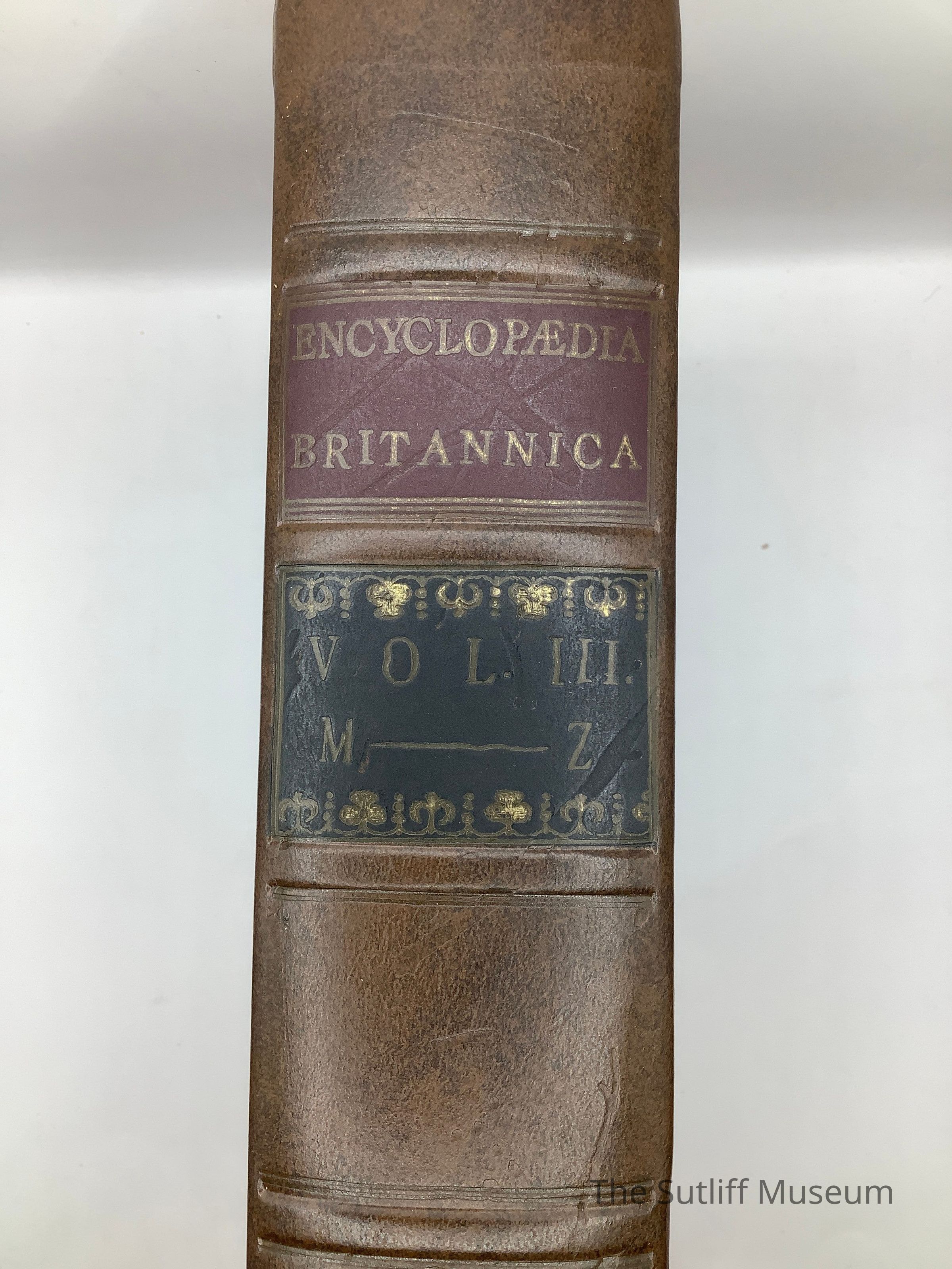 Leather bound Volume III, M-Z of a set of three reproduction of 1st edition of Encyclopedia Brittanica 1768-1771. The three volumes are in a cardboard holder. This set was a reproduction to commemorate the 200th anniversary of original work.Collection