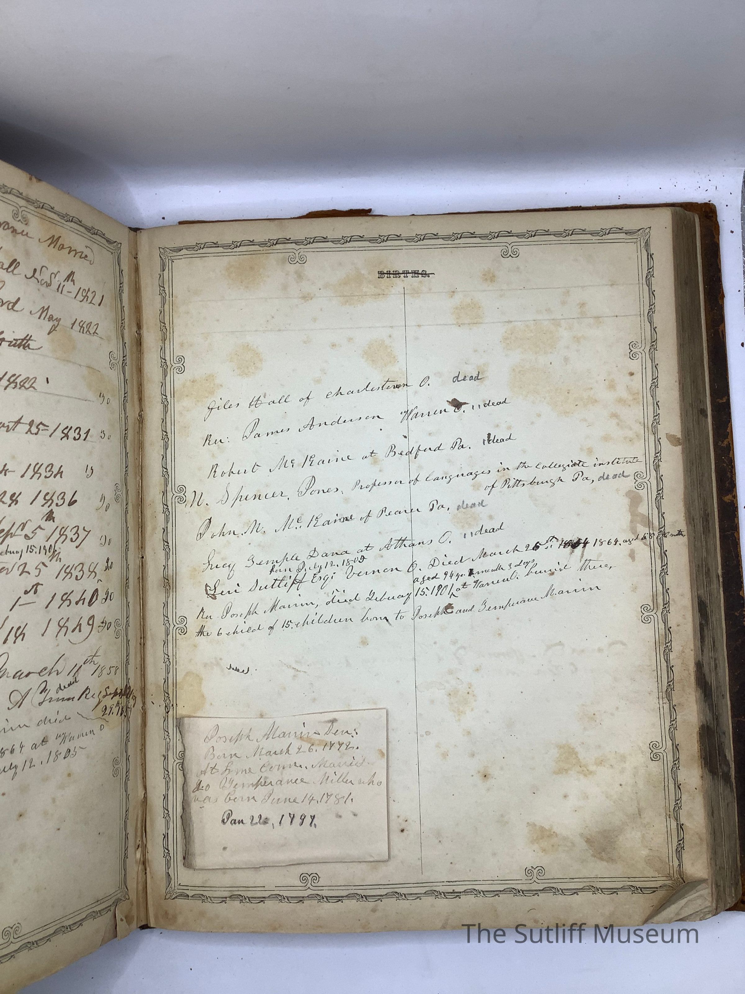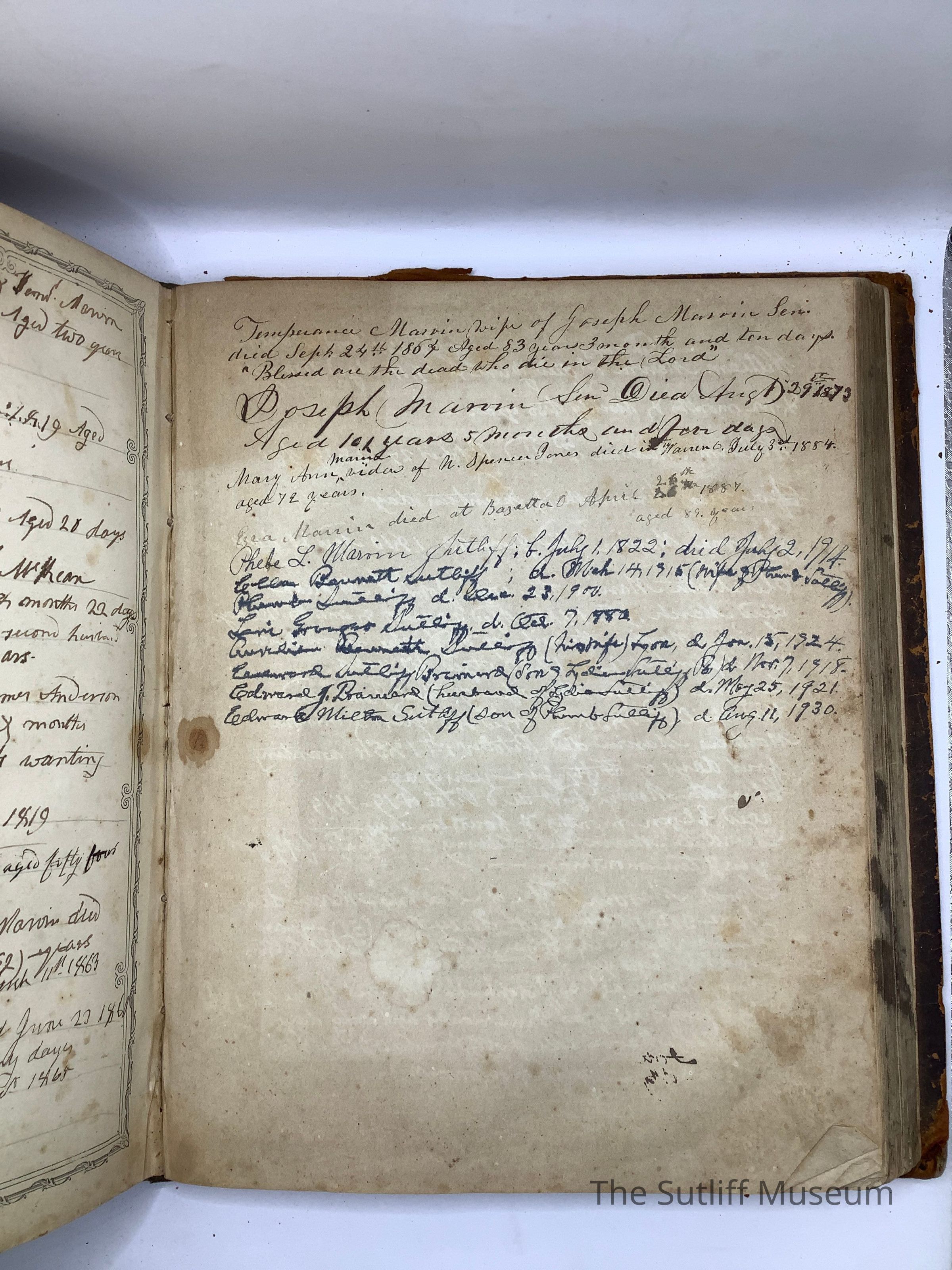 Bible belonging to Temperance Marvin in June 1855. Inside contains note: