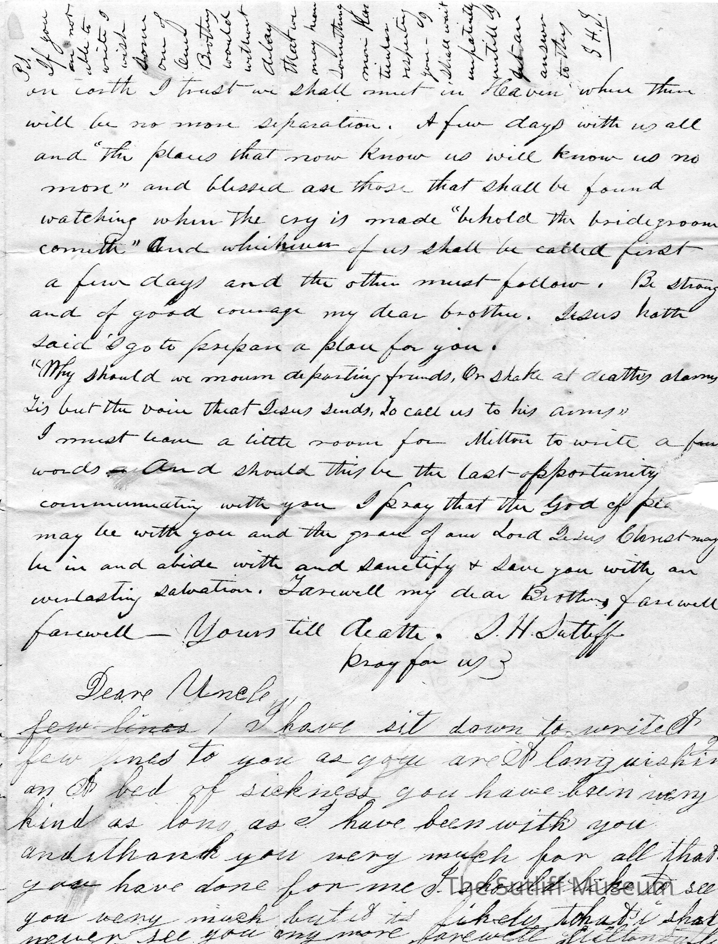 Letter from Samuel Harvey Sutliff to Flavel Sutliff regarding a letter Milton had sent to Allen Curtis Sutliff about Flavel's health, what they can all do for him as brothers, and that he is praying for him.Collection
