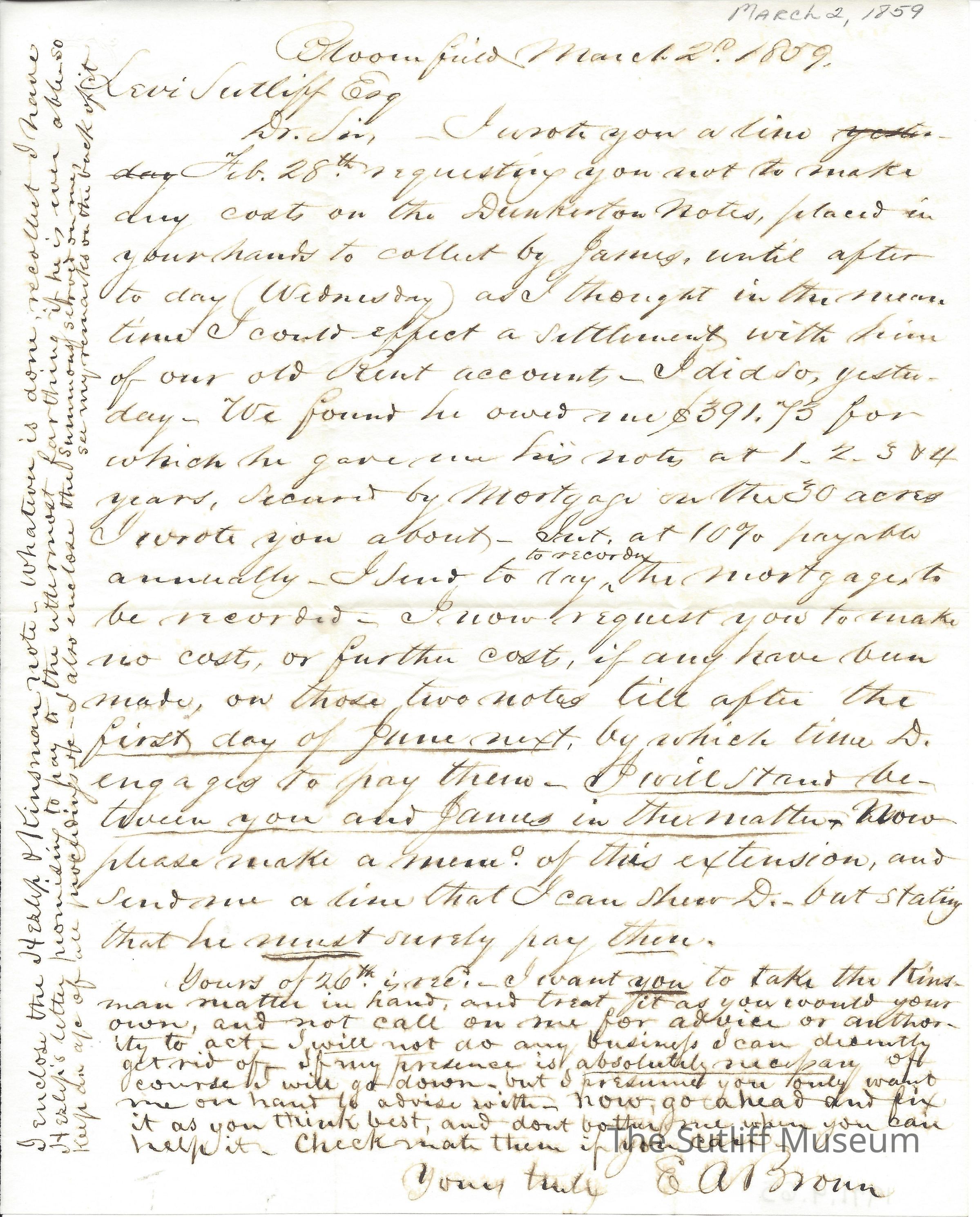 A letter from E.A. Brown to Levi Sutliff regarding the Dunkerton notes and payment.