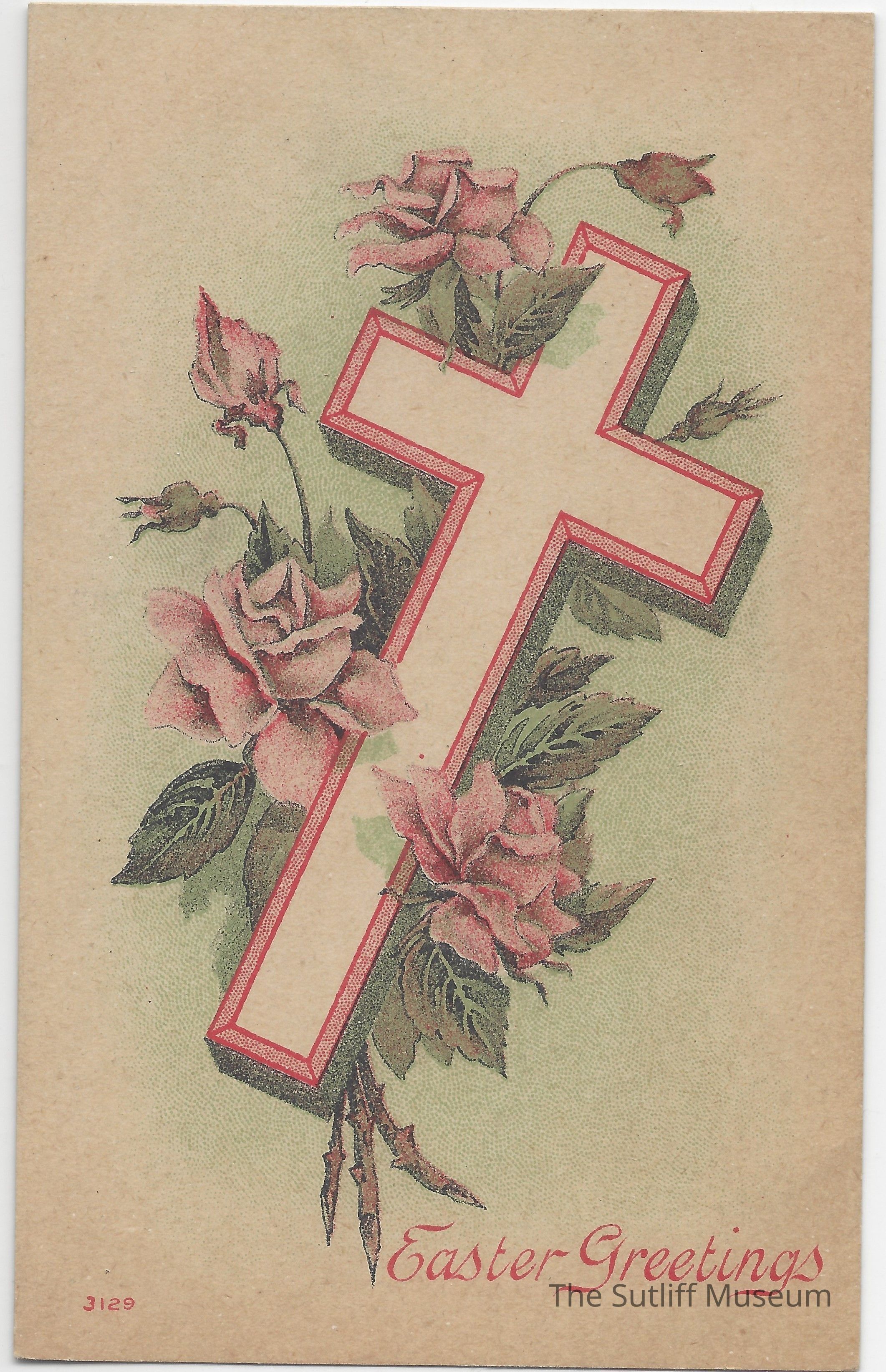 Easter postcard that depicts a cross with pink roses.