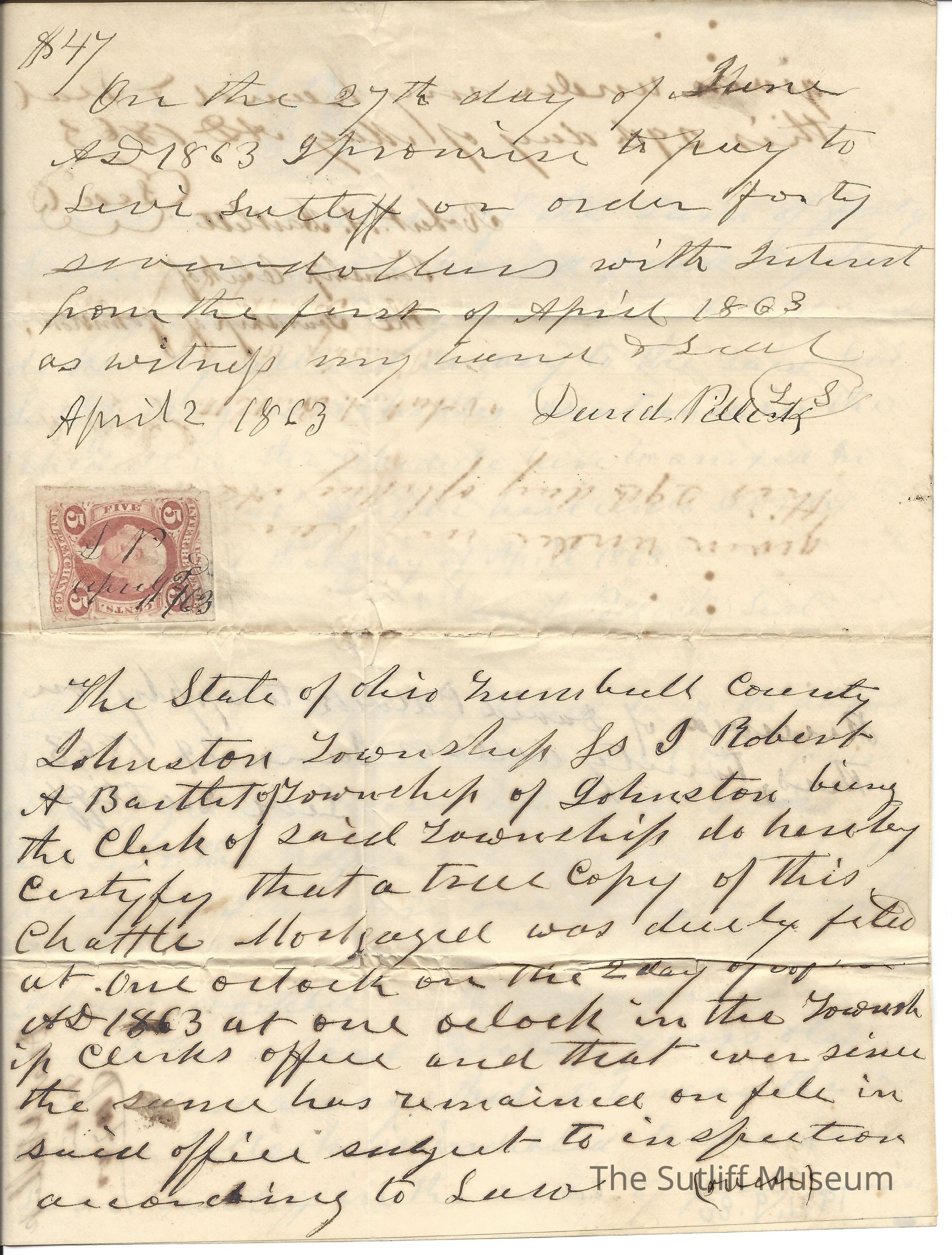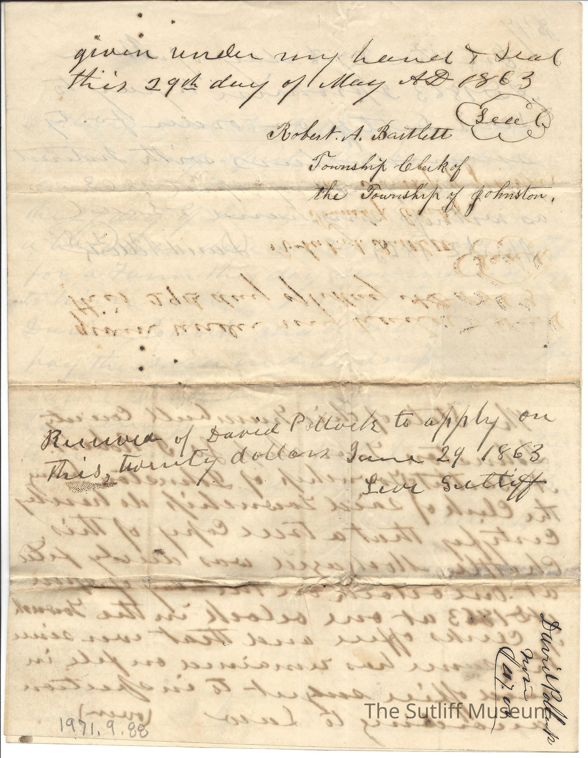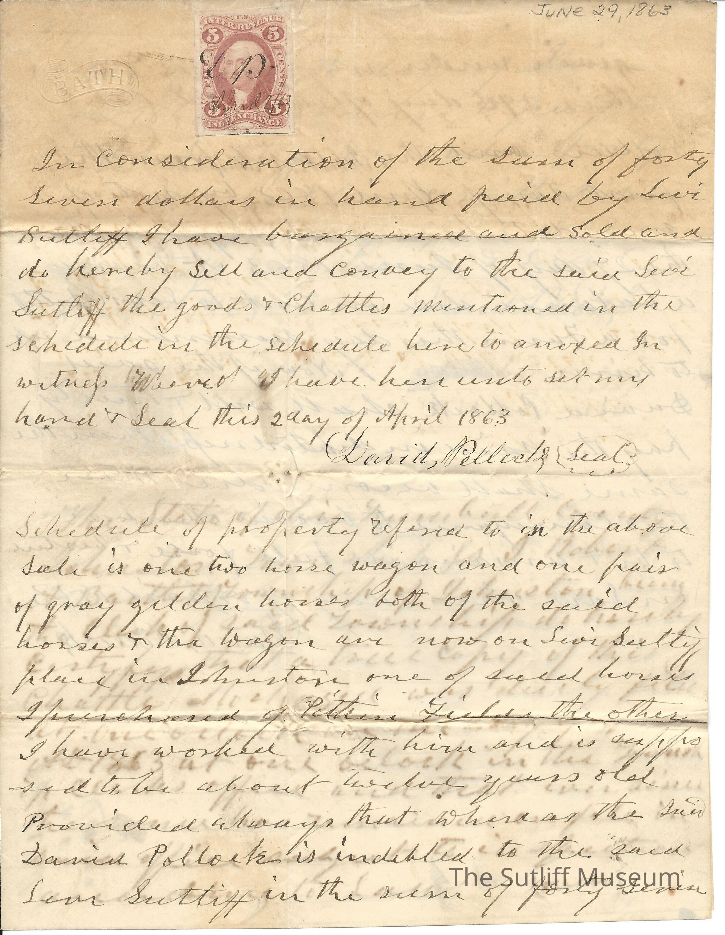 An agreement between David Pollock and Levi Sutliff regarding the sale of land and the payment.Collection