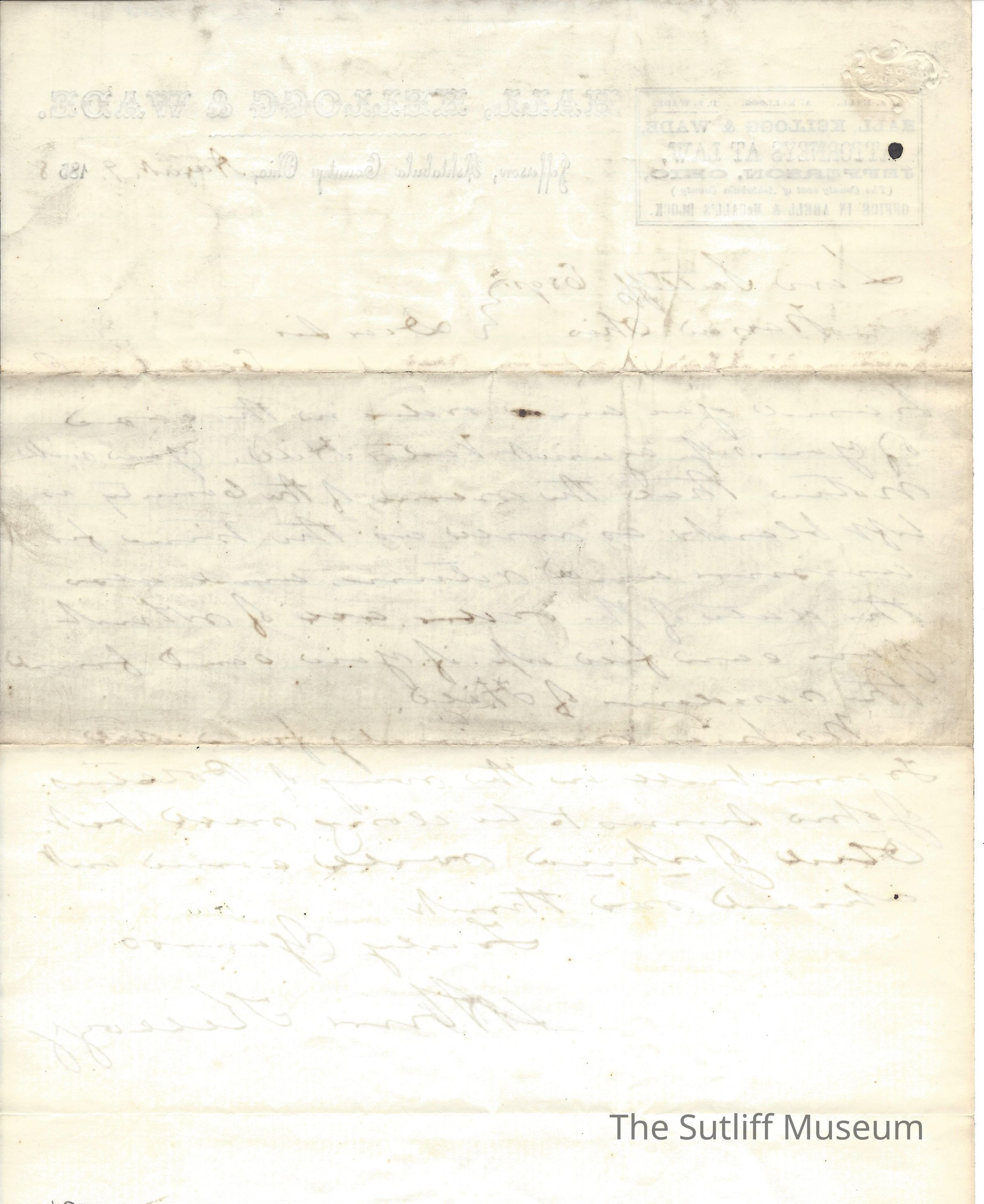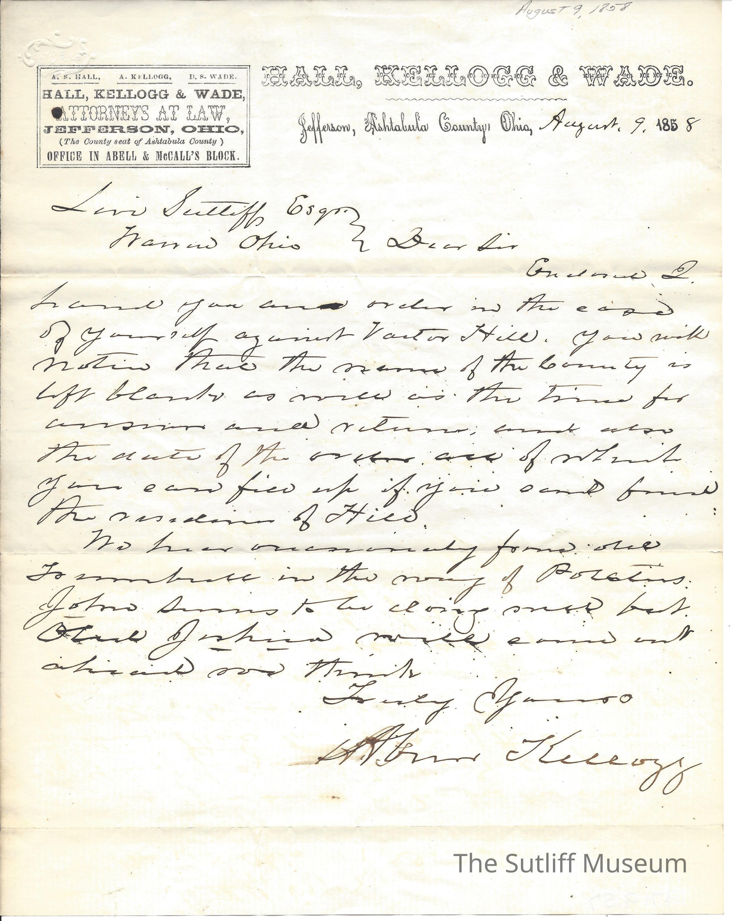 A letter from Abram Kellogg to Levi Sutliff regarding his legal case against Varter Hill.Collection