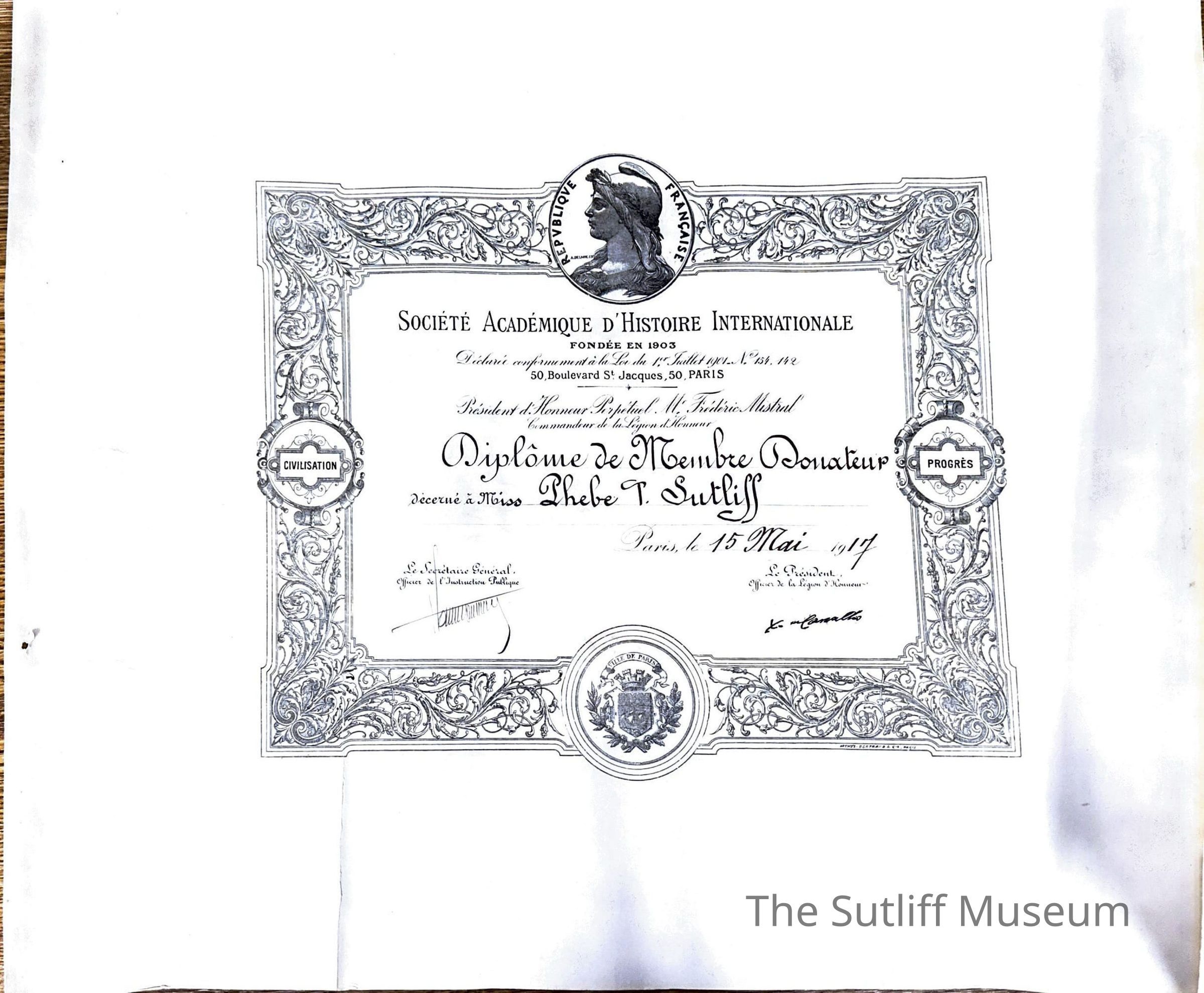 Membership certificate from the academic society to Phebe T. Sutliff. "Societe Academique Societe Academique D' Histoire Internationale, Fondee En 1903, Declarce conforment a la Loc du 1er Juillet 1904 N. 154.142, 50 Boulevard St. Jacques, 50, Paris, President d. Honneur Perpetual M. Frederic Mistral, Commandeur de la Ligion d' Honneur, Diplome de Membre Donateur, decerue a Miss Phebe T. Sutliff, Paris le 15 Mai, 1917, Le SAecretaire General, Officier de l' Justruction Pullique, Le President Officier de la Legion d' Honneur"Collection