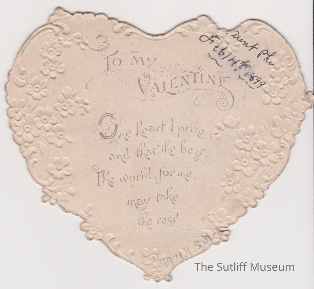 Heart shaped valentines day card with floral motif and a child in a hat on the front and "To My Velentine/ One heart I prize,/ and thar the best,/ The world, for me,/ may take/ the rest" printed on the back. On the back in black ink handwritten reads "Aunt Phe Feb 14th 1899"Collection