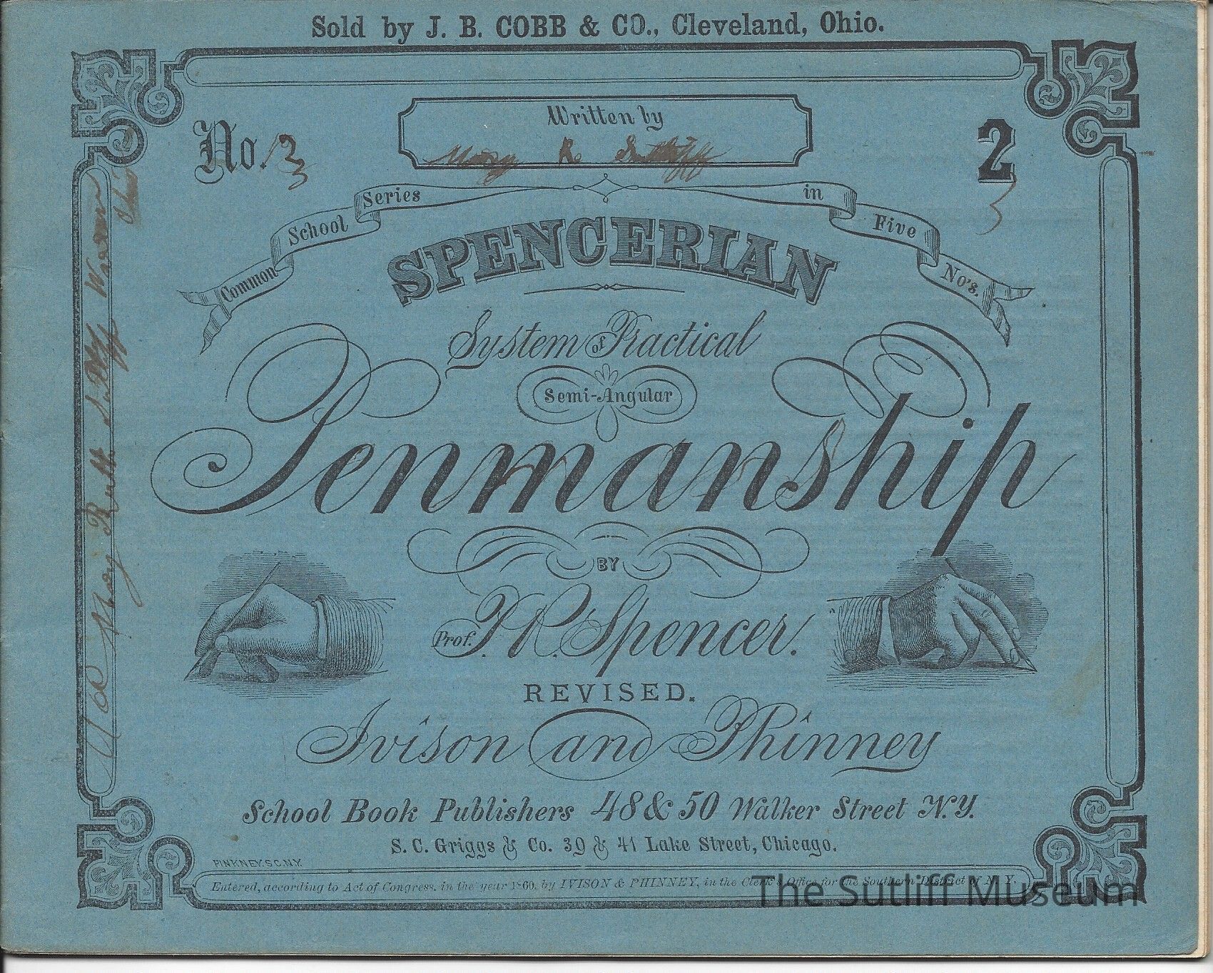 Spencerian System Practical Penmanship book. Blue soft cover with decorative black border and black text. On front cover is rectangular box with space for students to place name. "Mary R. Sutliff" has been handwriten in box and on side "Mary Ruth Sutliff Warren Ohio"