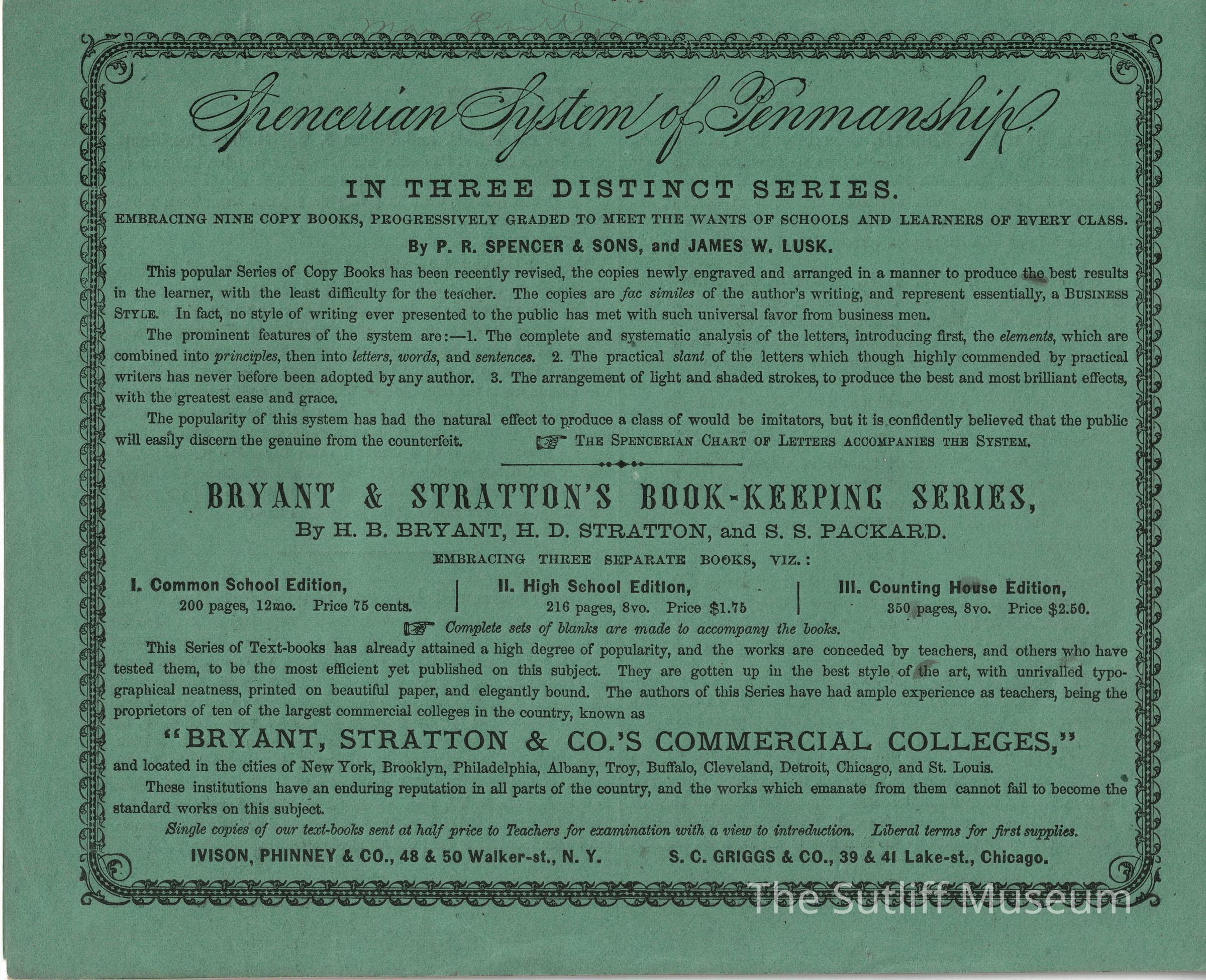 Spencerian System Practical Penmanship book. Green soft cover with decorative black border and black text. On front cover is rectangular box with space for students to place name. "Mary Ruth Sutliff Warren Ohio" has been handwriten in box and on side "Miss Mary R. Sutliff 1864." Book is only half filled.