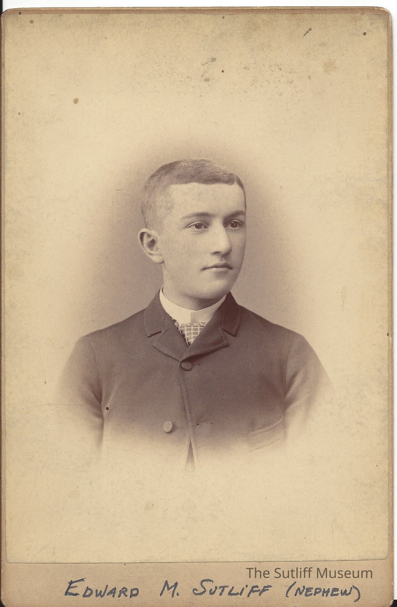 Photograph of Edward Milton Sutliff as an adolescent. Handwritten on the front of the photo is "Edward M. Sutliff (Nephew)." The back says: "Merry Christmas EMS. Edward M. Sutliff."Collection