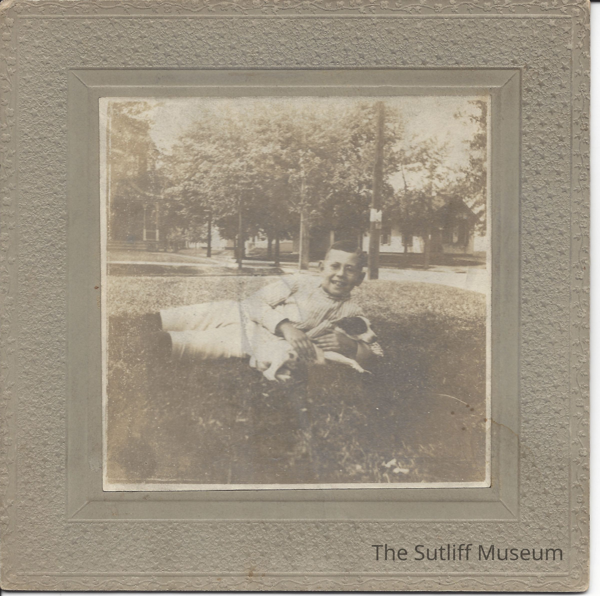 Photograph of Edward Sutliff Brainard and his dog Beauty in the side yard, Toledo, Ohio, dated Thursday August 1906.Collection