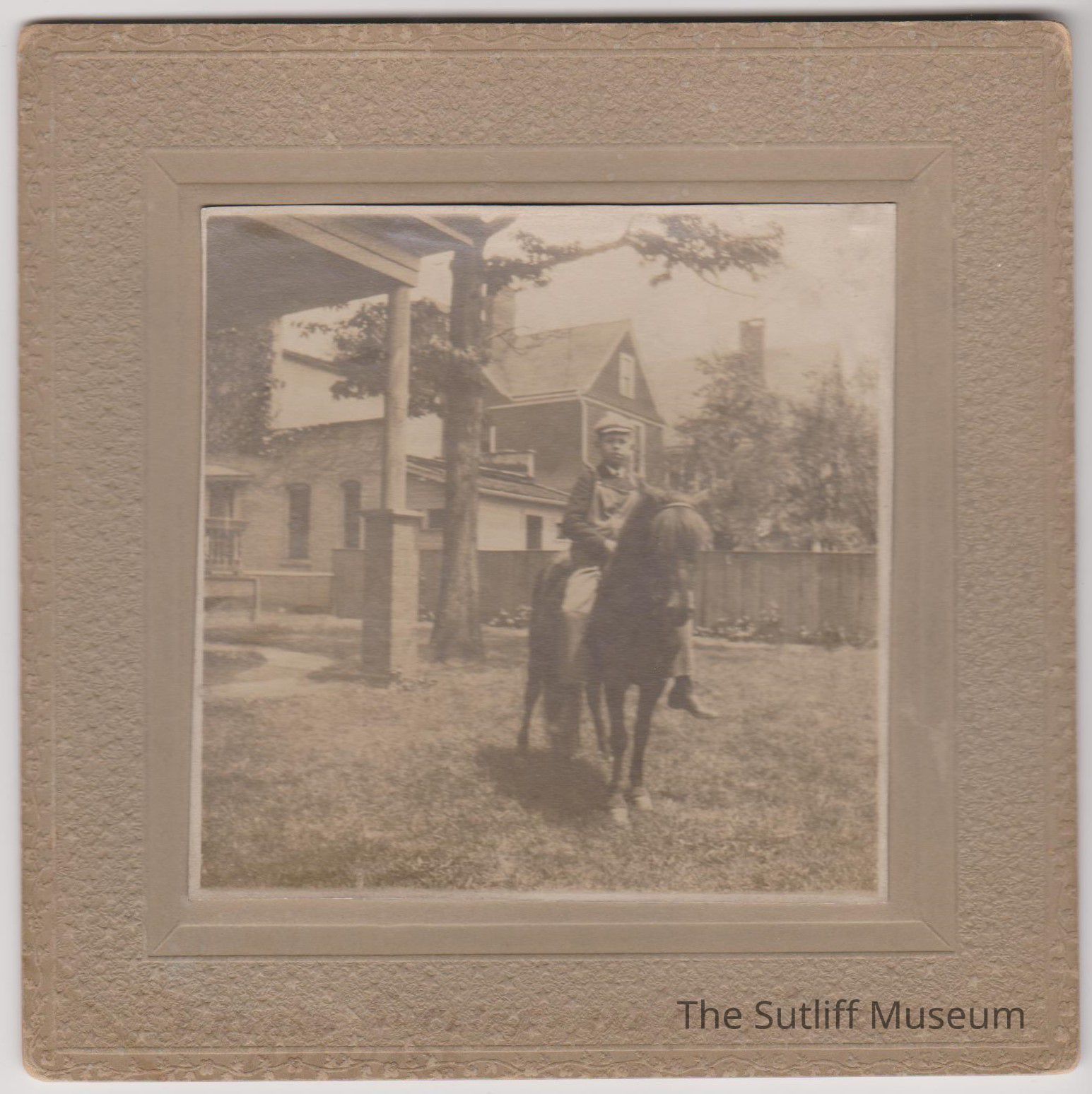 Photograph of Edward Sutliff Brainard and his pony "Midget" in the back yard in Toledo Ohio