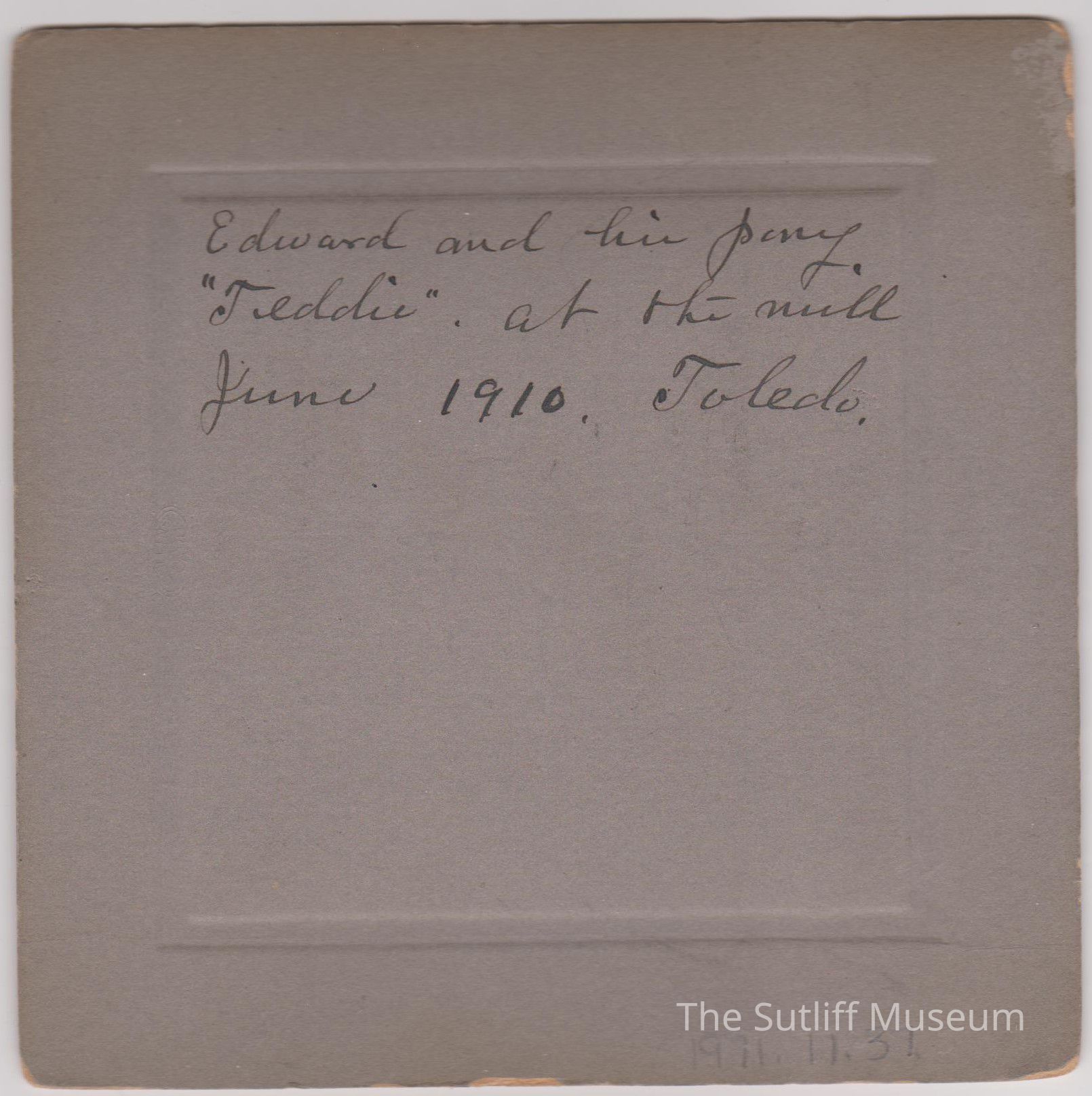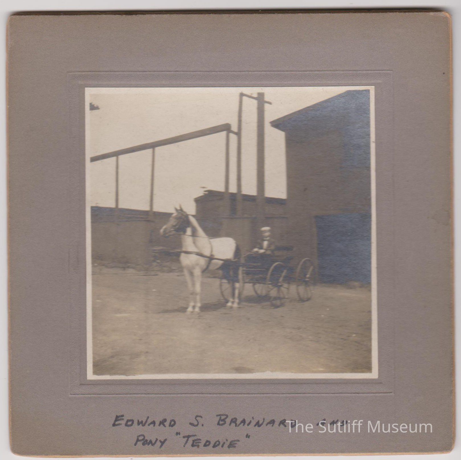 Photograph of Edward Sutliff Brainard. Edward is in a cart that is pulled by his pony "Teddie" at the mill in Toledo, July 1910
