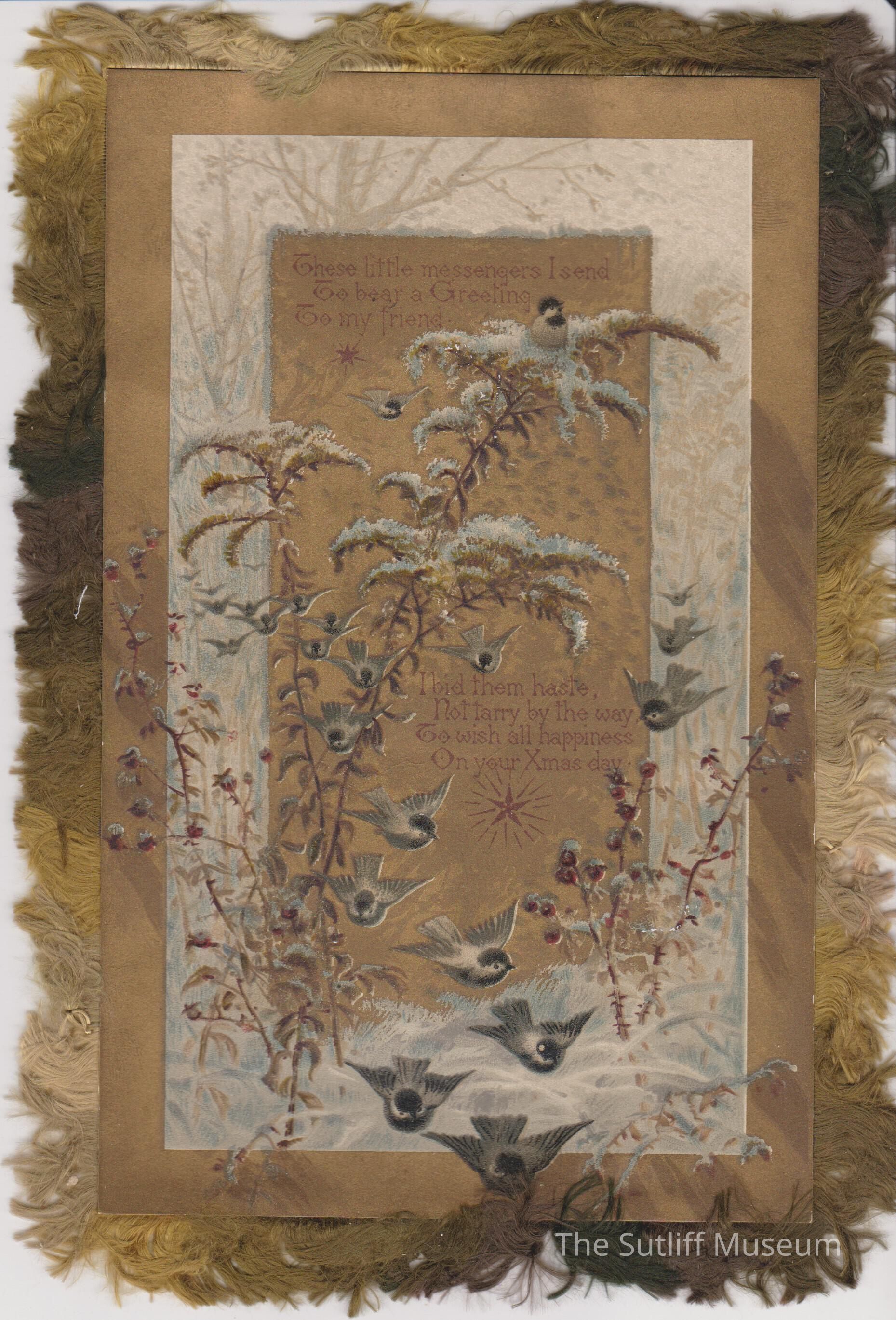 A Christmas greeting card with tan, gold and brown fringe around the edges. The front has a winter scene with plants and birds. "These little messangers I send/ To bear a Greeting/ To my friend./ I bid them haste,/ Not tarry by the way/ To wish all happiness/ On your Xmas day." The reverse has a print of yellow and green floral with birds and "Merry/ X/ Mas". On the reverse side on the bottom right corner in small text, "Copyright 1881 by Praug & Co. Boston"