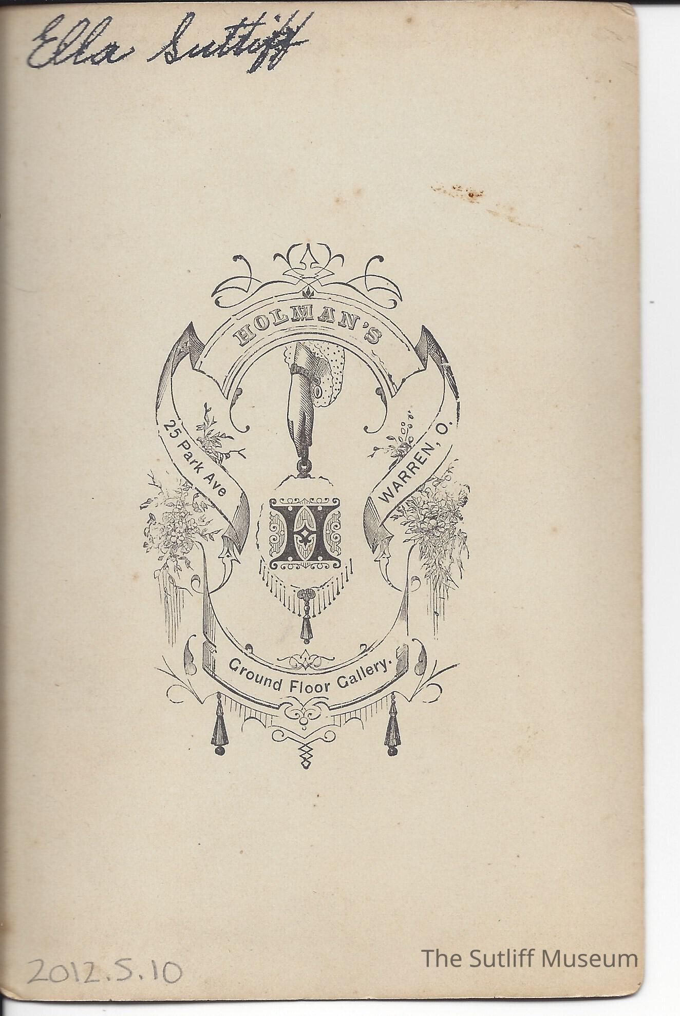 The item is a photograph portrait of Ella Sutliff. It is sepia toned and Ella is wearing a blouse or dress and her hair is pinned up. The photograph was taken by Holman, Park Avenue, in Warren, Ohio. The photographer's information is listed on the back.Collection
