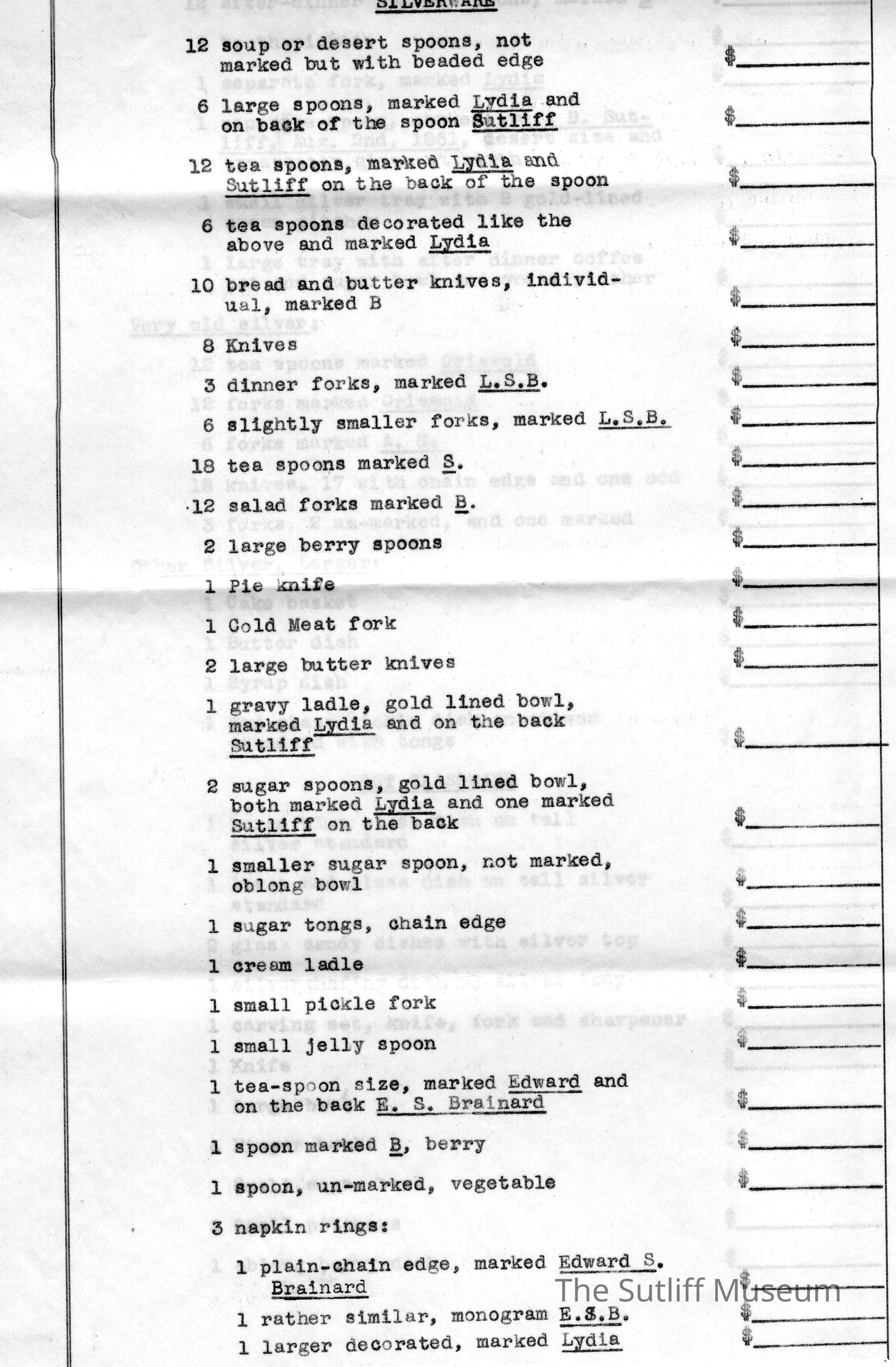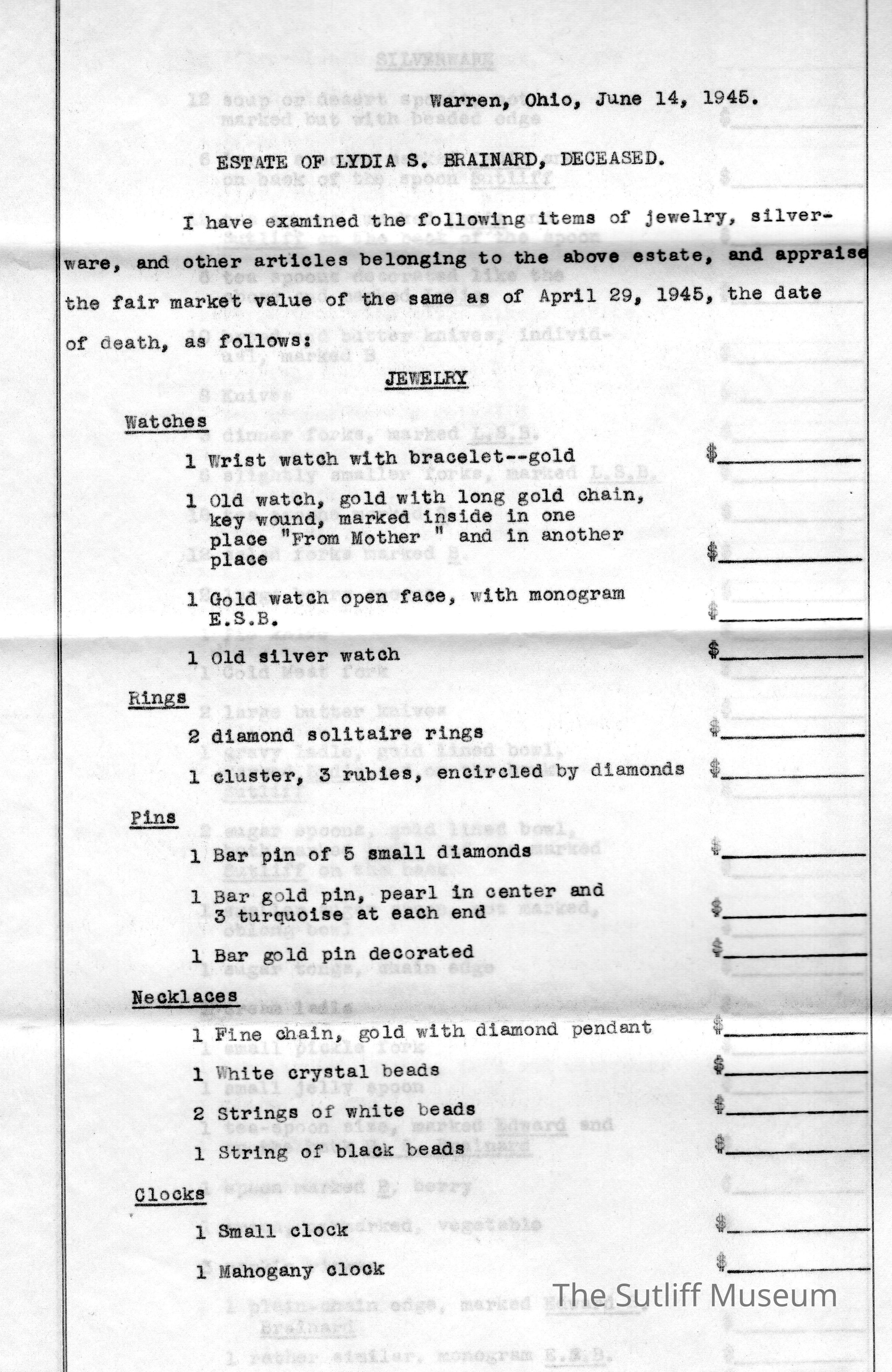 A record of the Estate of Lydia Sutliff Brainard. A record of all her valuable jewelry, silverware, and other articles.Collection