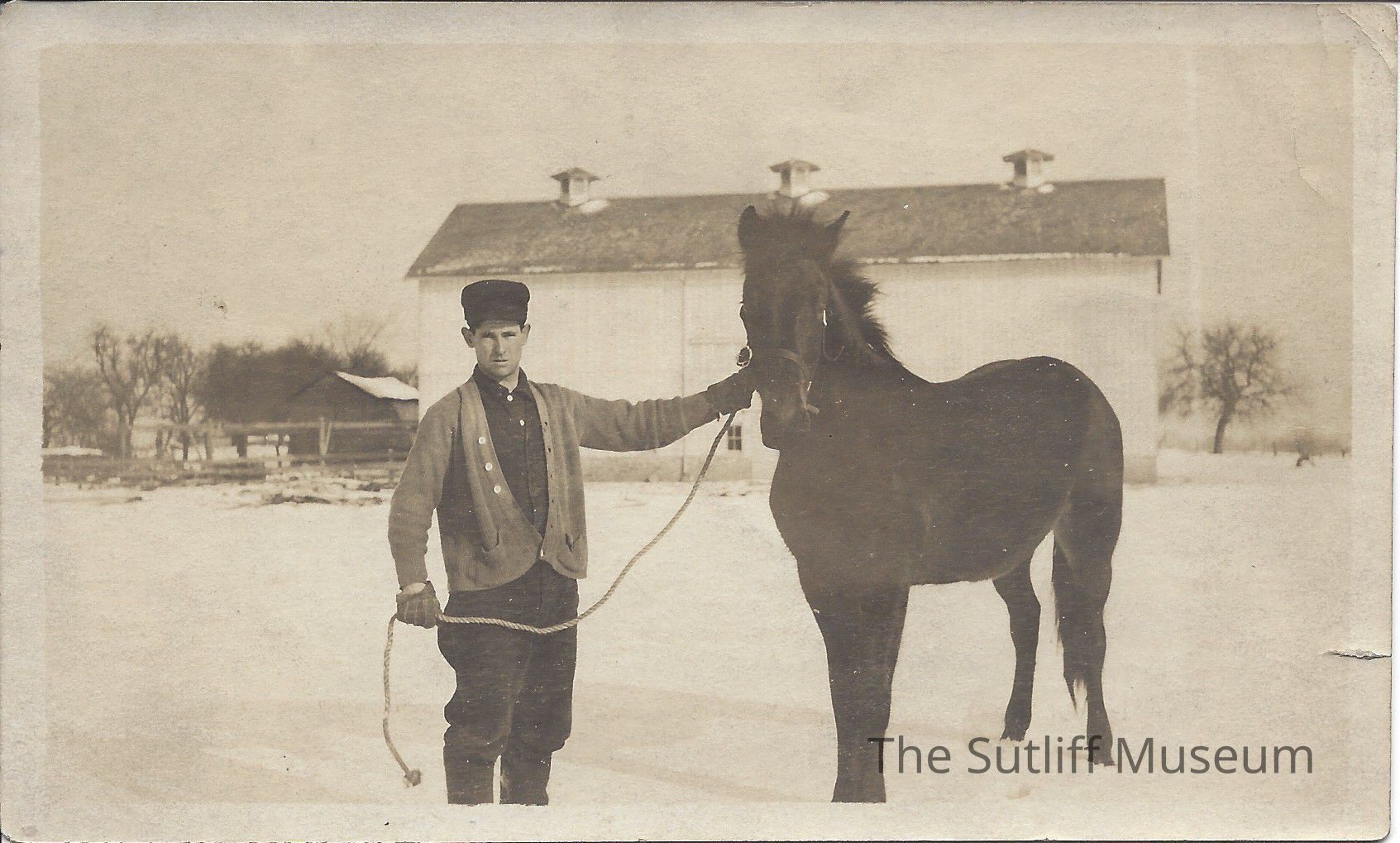 Photo of Ezra Deming Marvin with a horse in snow, undated.Collection