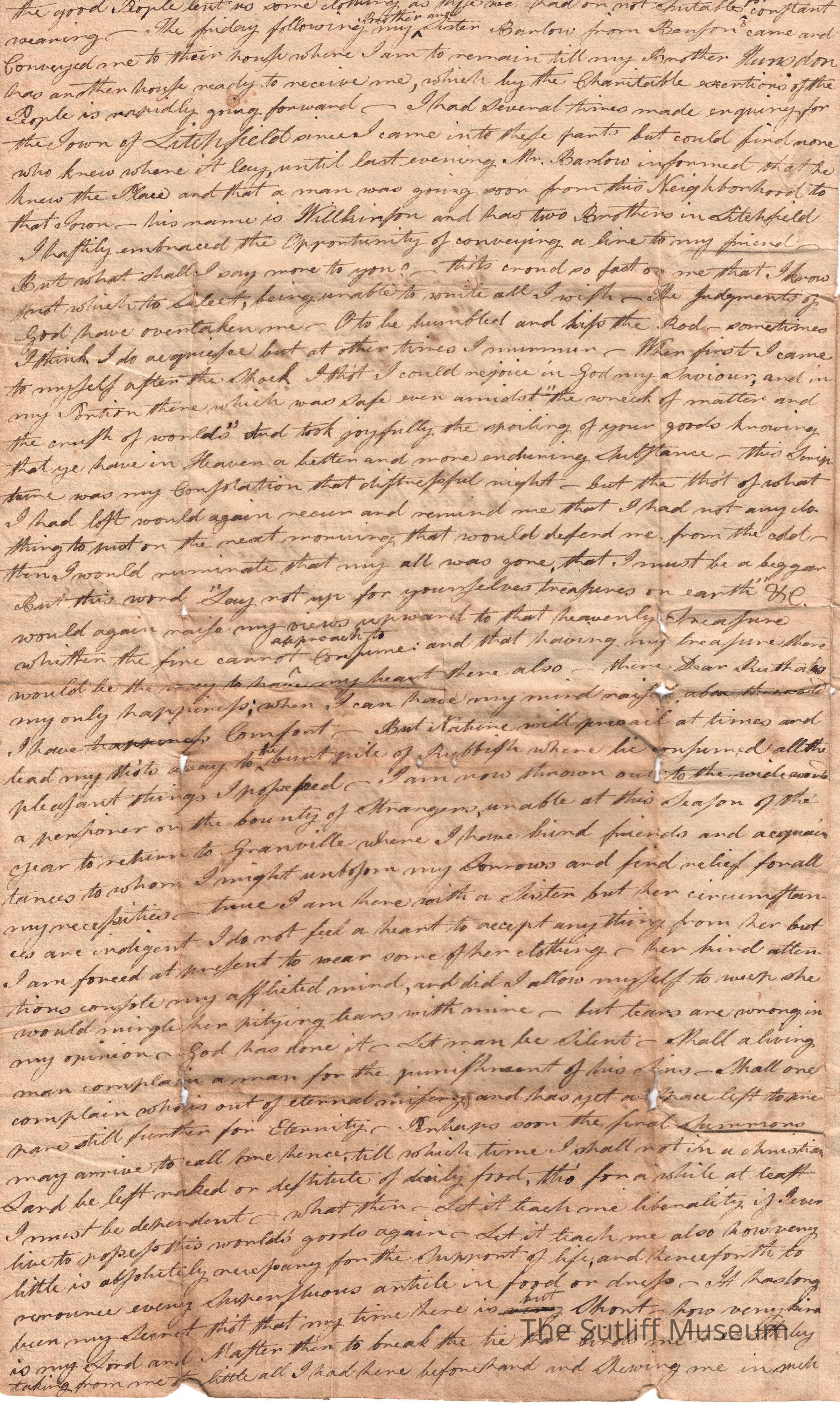A letter from Sally Prat to her sister Ruth Sutliff with updates, her opinions, and news of a fire.Collection