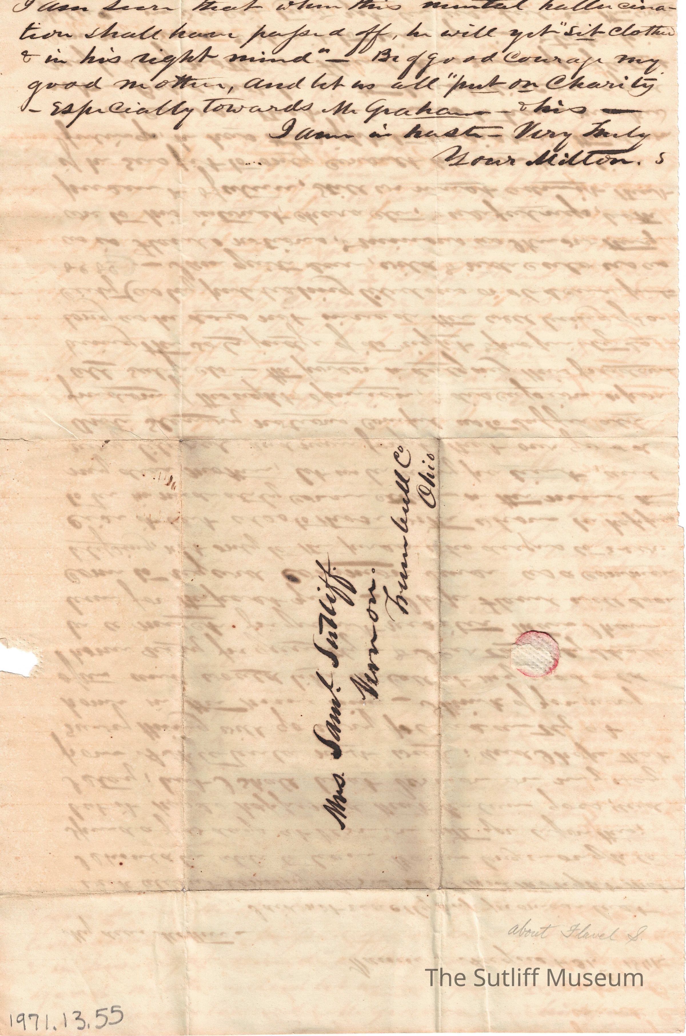 A letter from Milton Sutliff to his mother Ruth Sutliff regarding his plans to visit, his anti-slavery notions, and his distaste for Flavel's notions.Collection