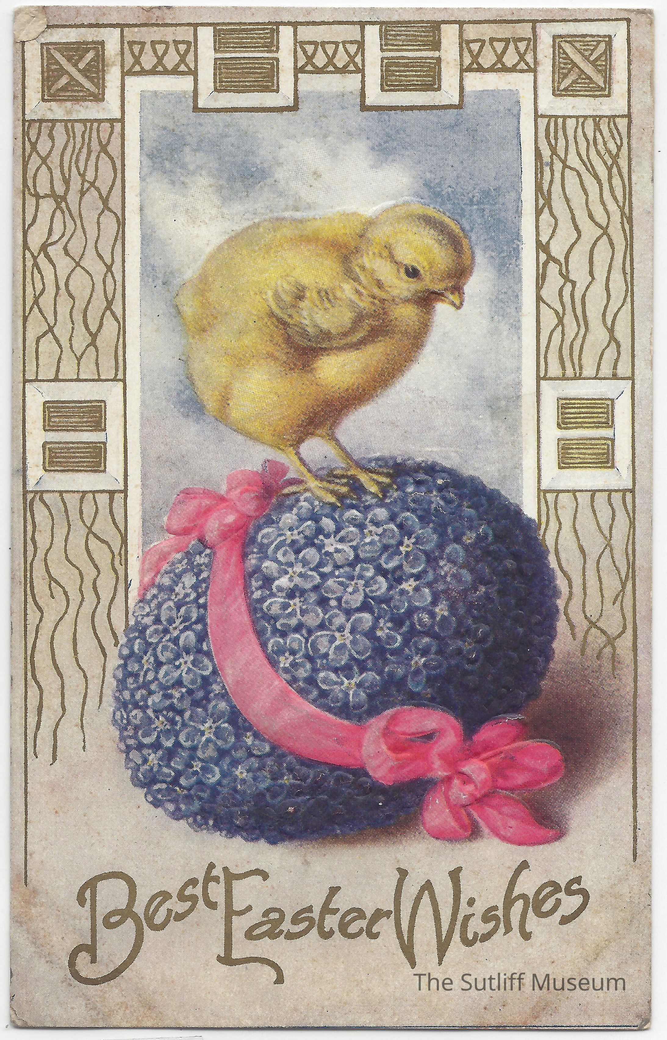 Easter postcard that depicts a baby chick standing on a blue egg made of flowers with a pink bow.