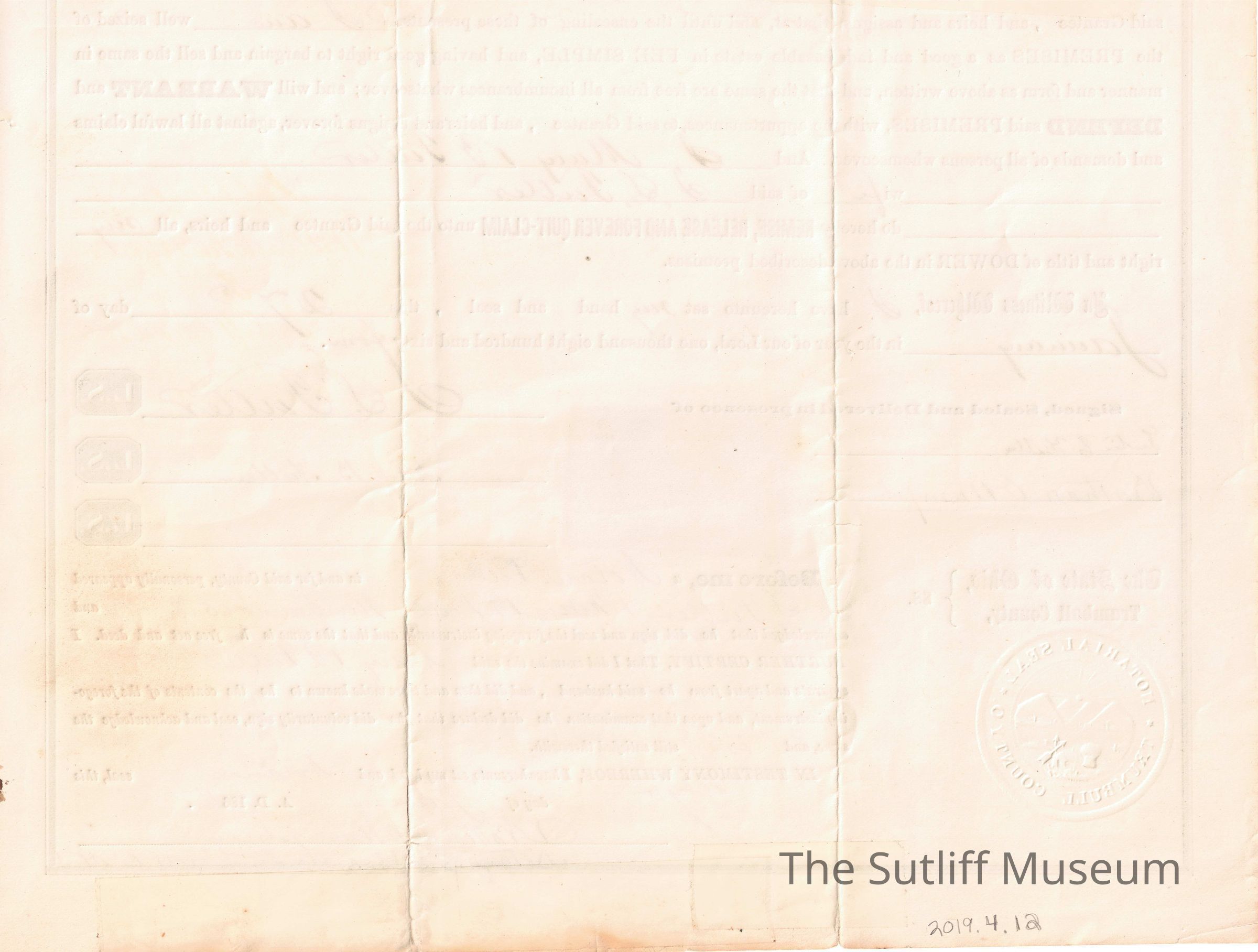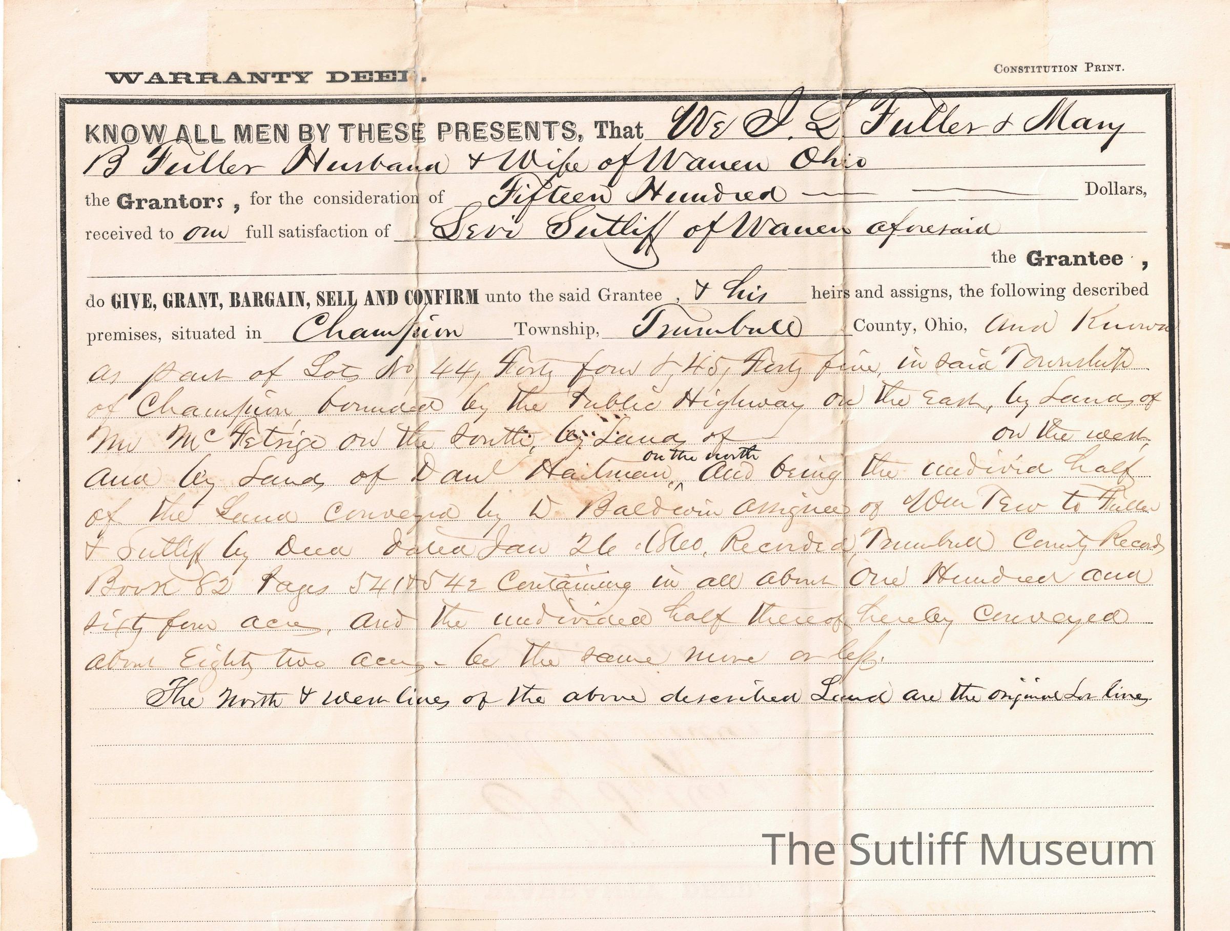A deed from I.S. Fuller and Mary B. Fuller to Levi Sutliff declaring the sale of land for $1500.Collection