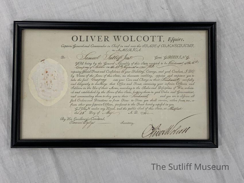 Framed appointment for Samuel Sutliff as Lietenant of the 6th Company of Miliatia 25th Regiment, State of Connecticut 1796.