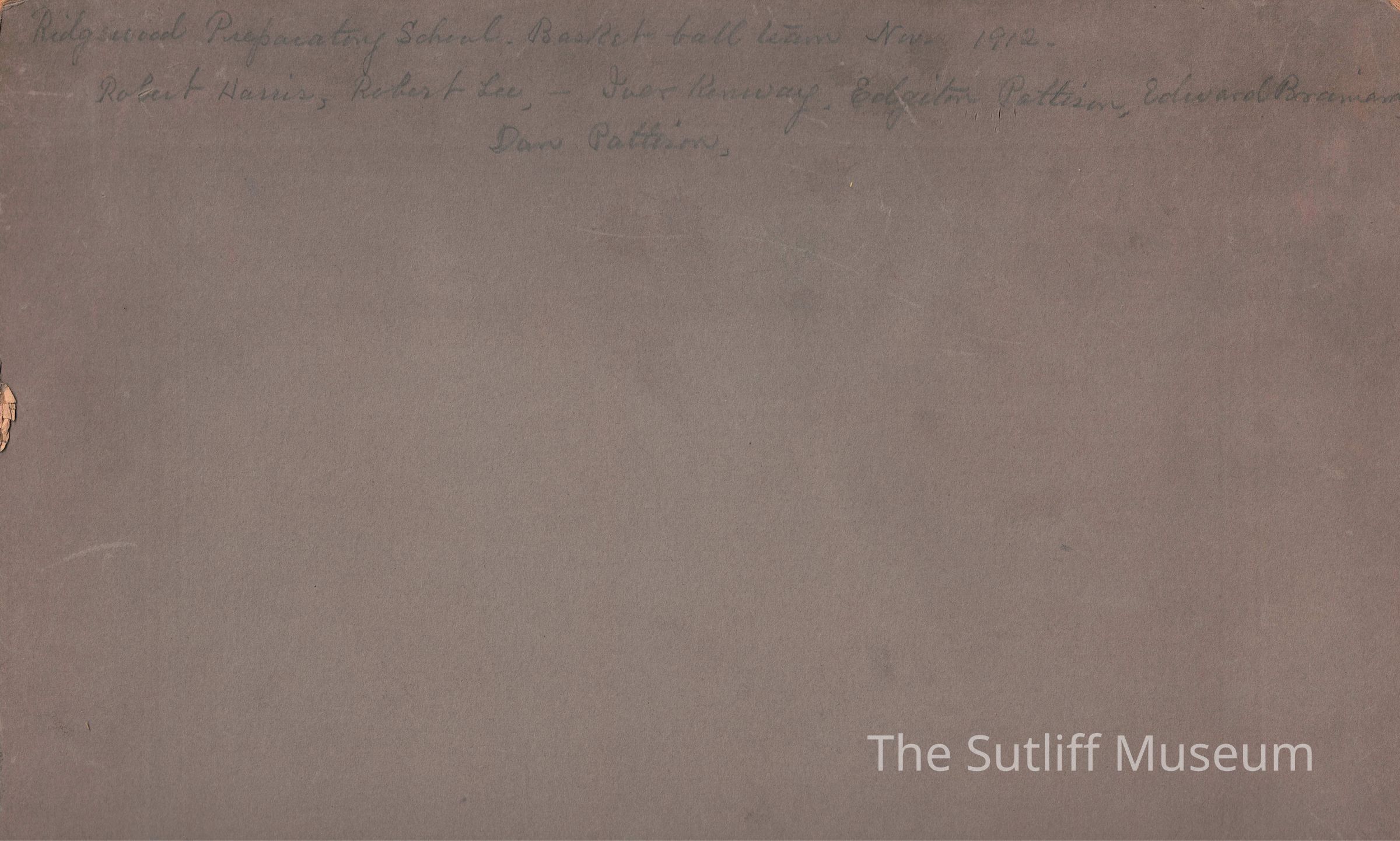 The sepia photograph shows Edward Brainard Sutliff and his basketball team at Ridgewood Preparatory in November of 1912. Robert Harris and Robert Lee are in the top row. Iver Renway, Edgiton Pattison, and Edward Brainard are in the second row. Dan Pattison is in the bottom row.