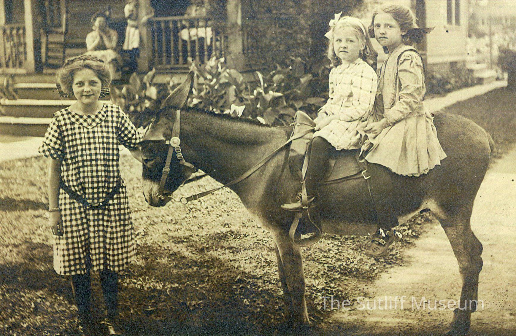 Photograph of Elizabeth Herlinger who is holding the head of the donkey while her sisters, Gertrude (first) and Martha (second) are sitting in the saddle. The photograph was taken in front of their home on Scott Street in Warren, Ohio.Collection