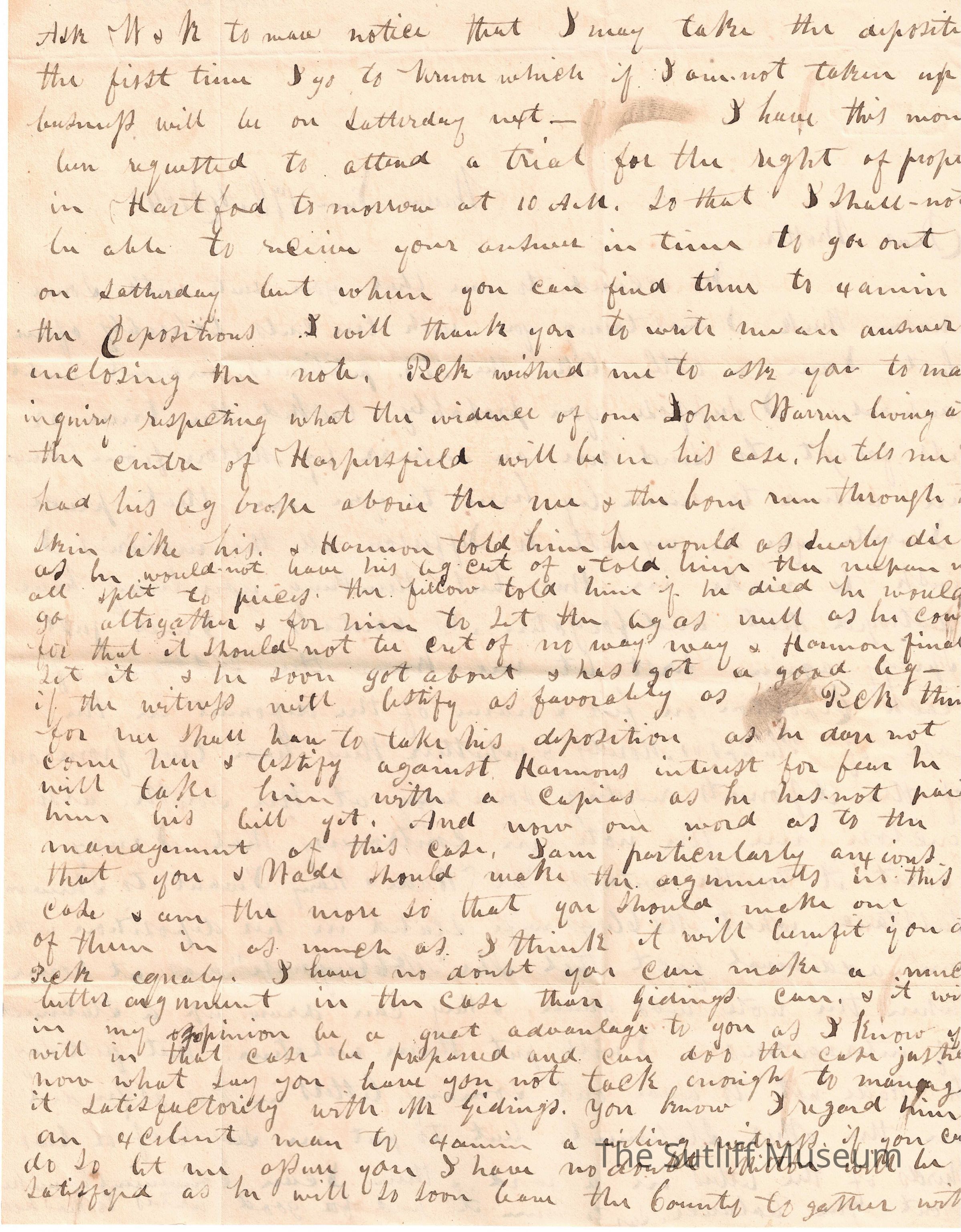 Letter from Calvin Granger Sutliff to Flavel Sutliff regarding a legal case, a case he has been called to testify in, and the legal abilities of Flavel and Joshua Reed Giddings.Collection