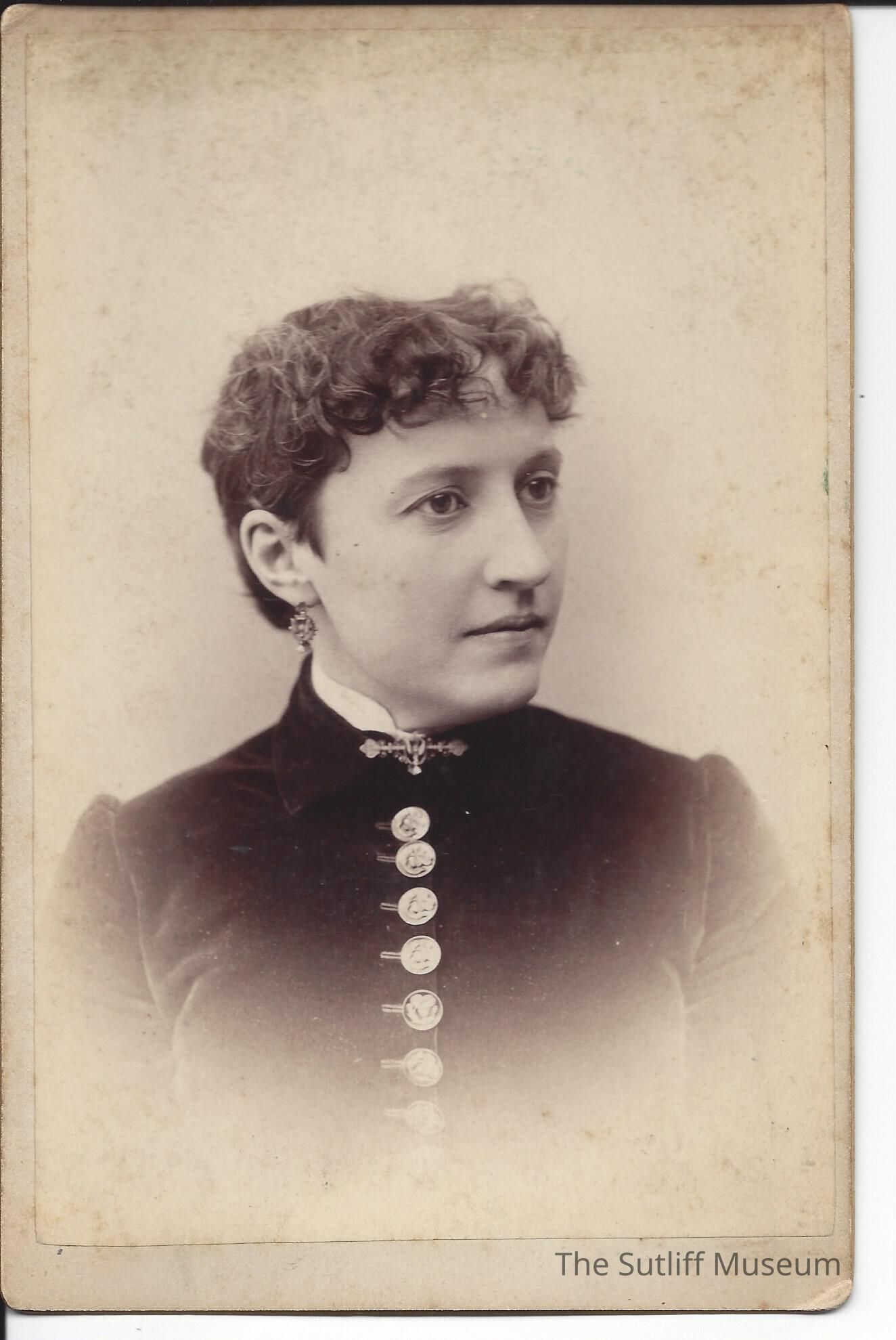 The item is a photograph portrait of Ella Sutliff. It is sepia toned and Ella is wearing a blouse or dress and her hair is pinned up. The photograph was taken by Holman, Park Avenue, in Warren, Ohio. The photographer's information is listed on the back.Collection