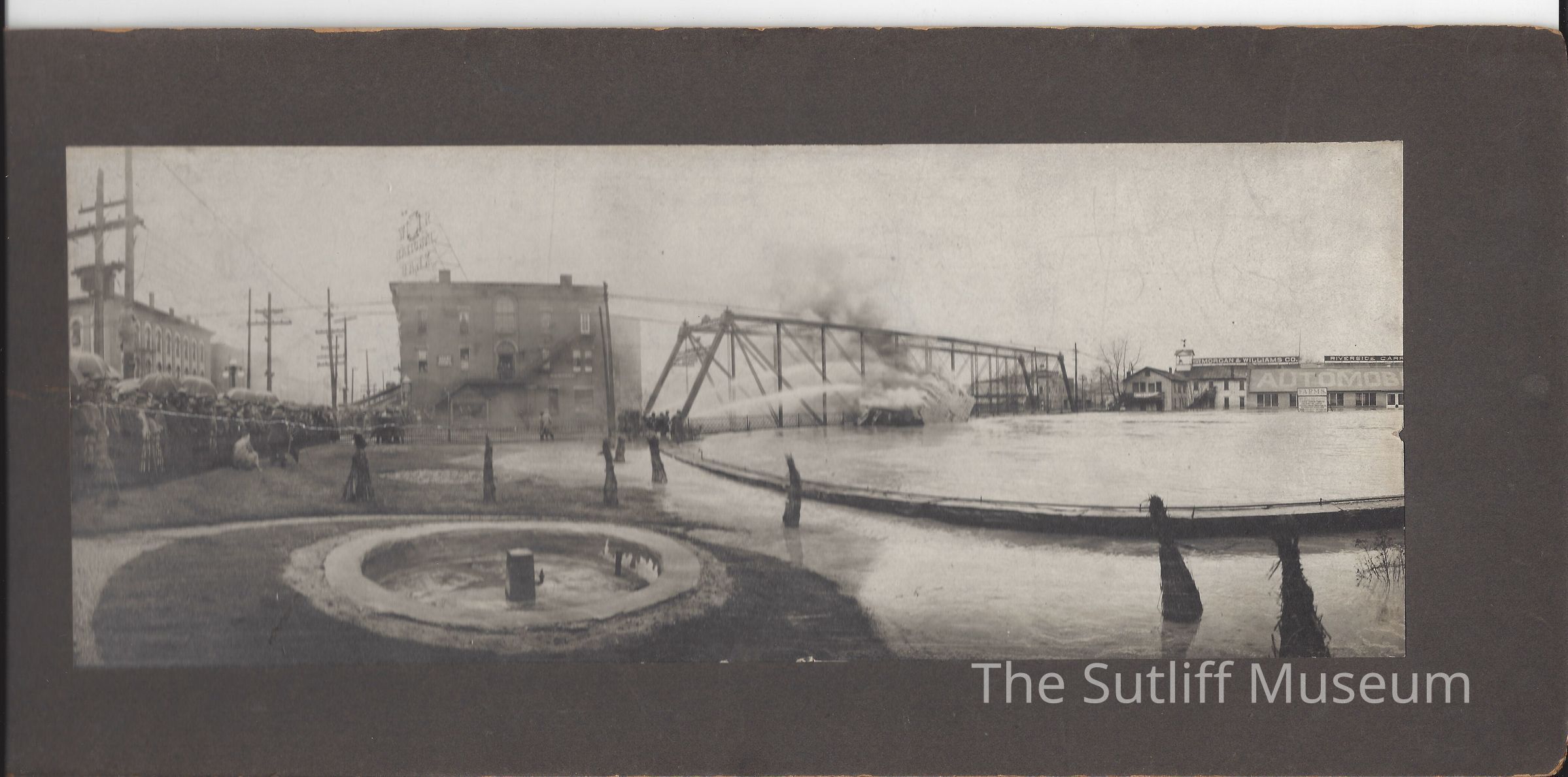 Photograph of the 1913 Flood, panorama of West Market Street Bridge in Warren, Ohio. Crowds are kept behind a fence on the left side of photo while it appears that firefighters are putting out a fire next to the bridge.Collection