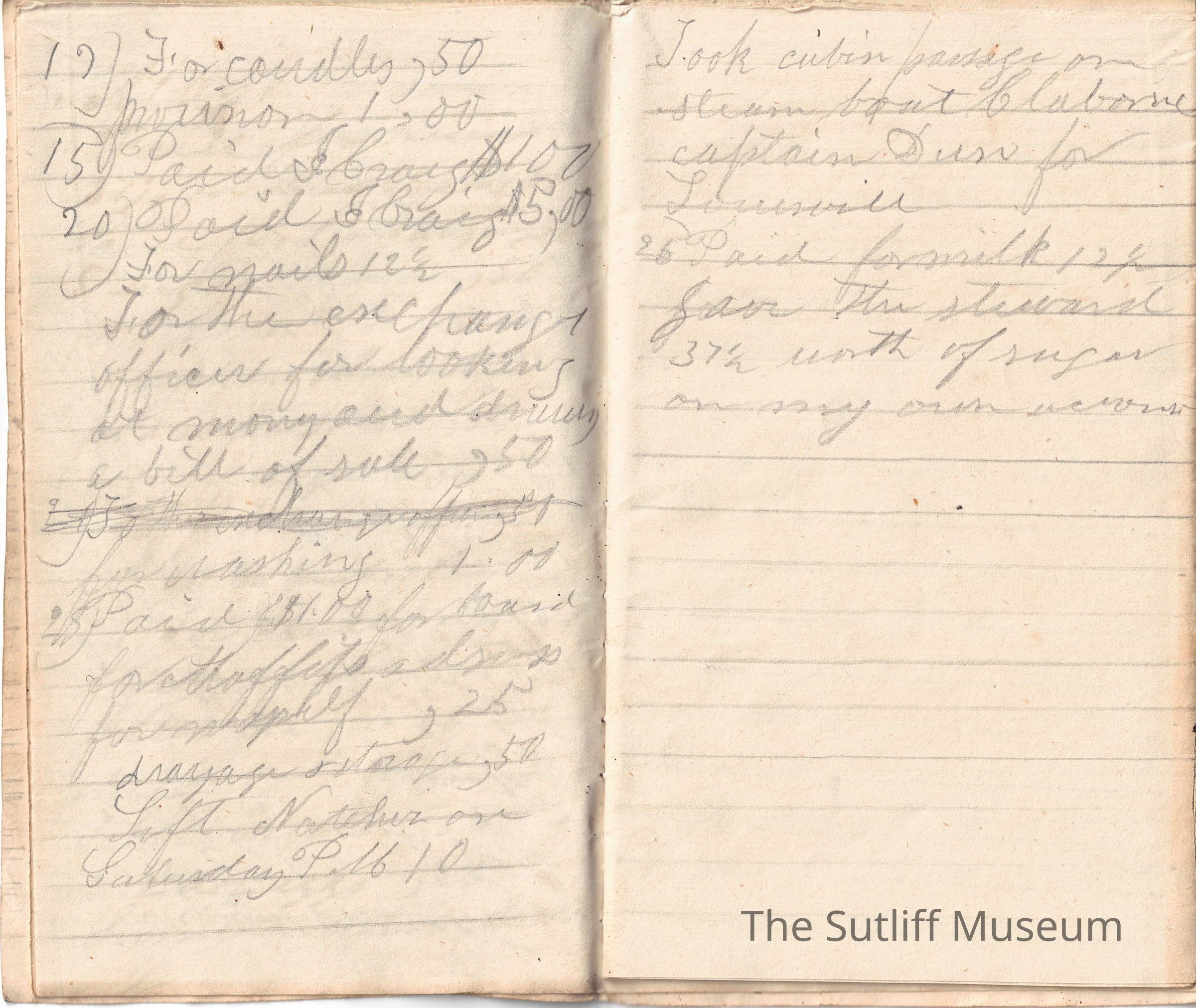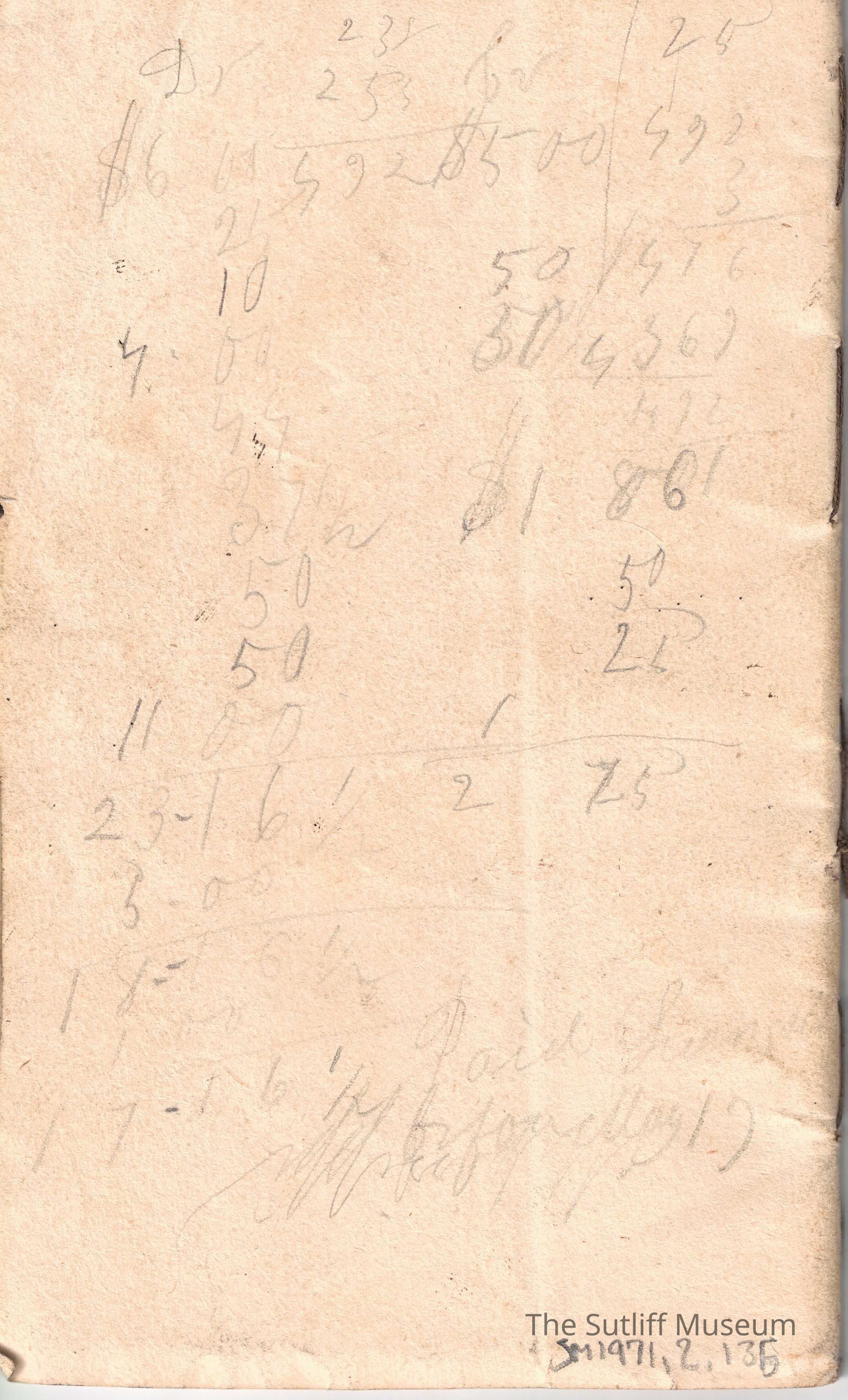 A business journal taken by Levi Sutliff to record wages. There is a section of unused pages in the middle of the journal as it was started from both ends for different reasons.Collection