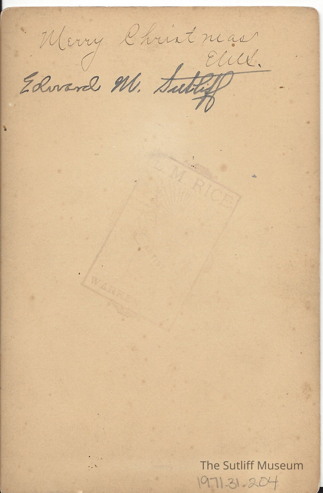 Photograph of Edward Milton Sutliff as an adolescent. Handwritten on the front of the photo is "Edward M. Sutliff (Nephew)." The back says: "Merry Christmas EMS. Edward M. Sutliff."Collection