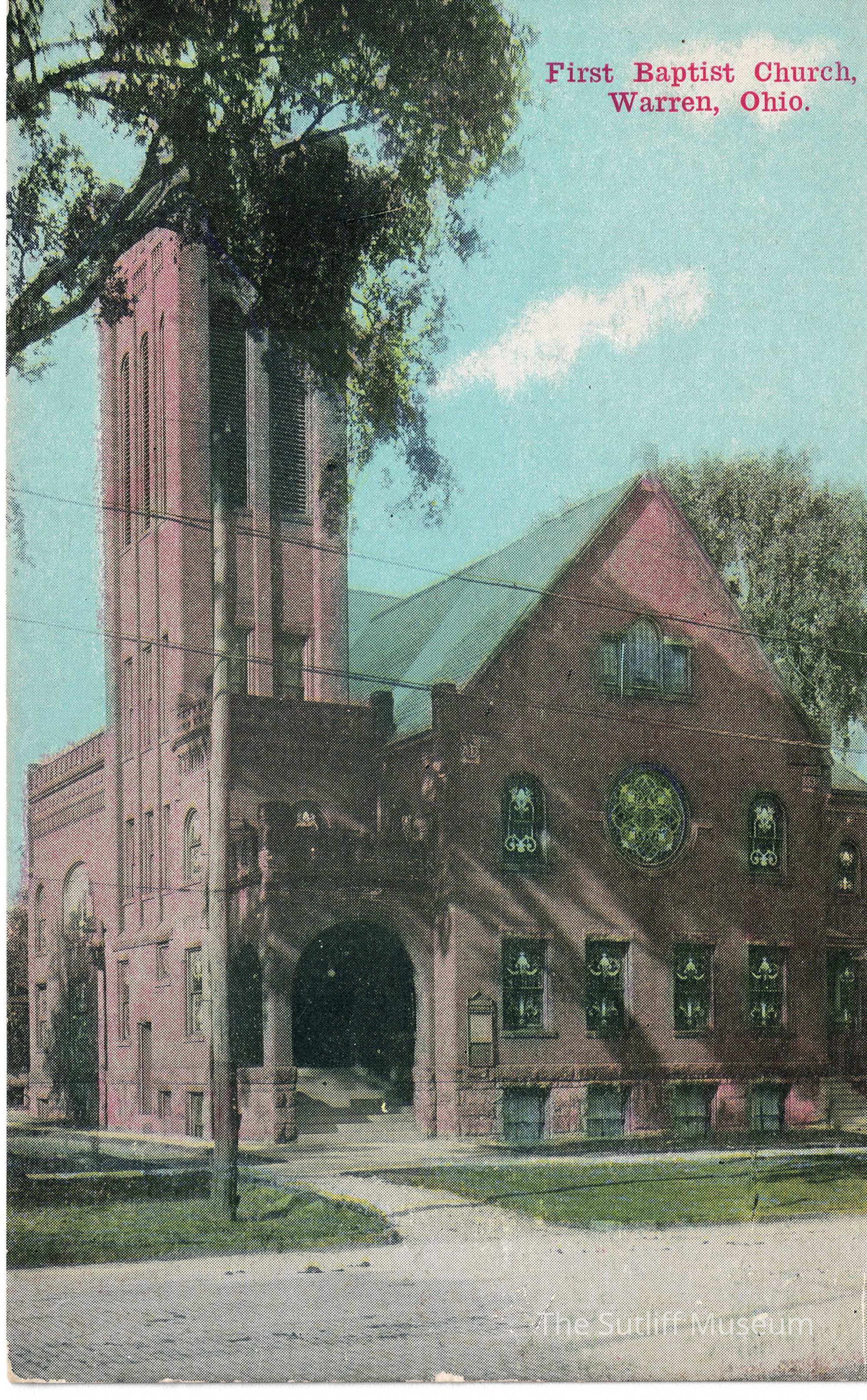 Architecture, Art, Artifacts, Correspondence/Postcard, Cultural Activities, Domestic Life, People, Postal Services, Social & Personal Activity, Churches & Temples, Churches & Temples/Exterior, Religion, Warren, Ohio, First Baptist Church