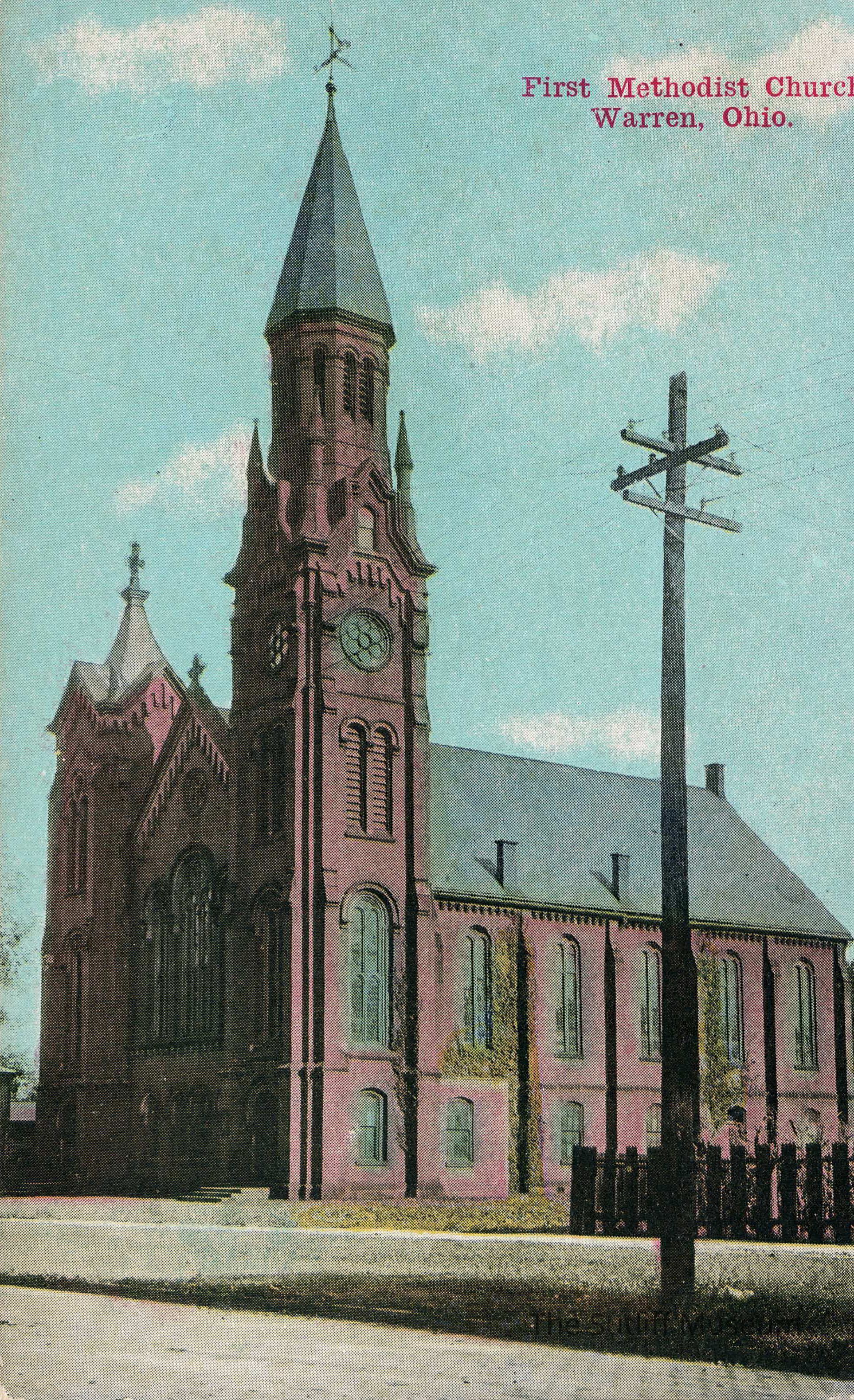 Architecture, Art, Artifacts, Correspondence/Postcard, Cultural Activities, Domestic Life, People, Postal Services, Social & Personal Activity, Churches & Temples, Churches & Temples/Exterior, Religion, Warren, Ohio, First Methodist Church