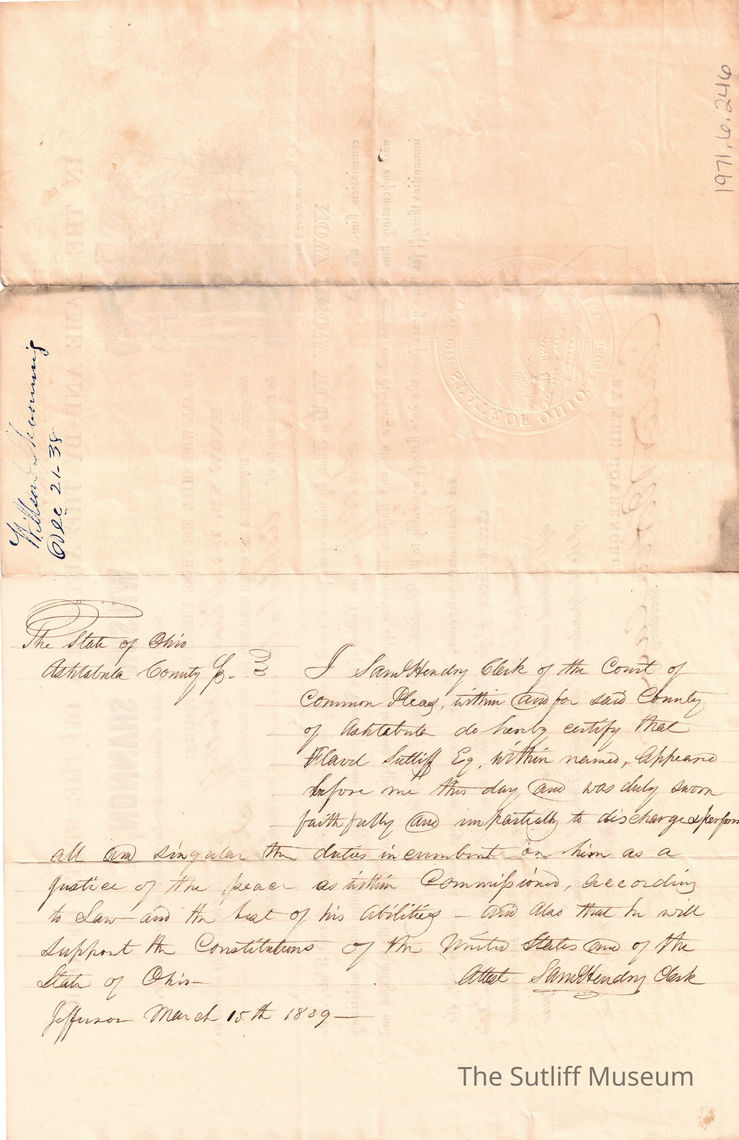A certificate describing Flavel Sutliff being elected Justice of the Peace for Jefferson township.Collection