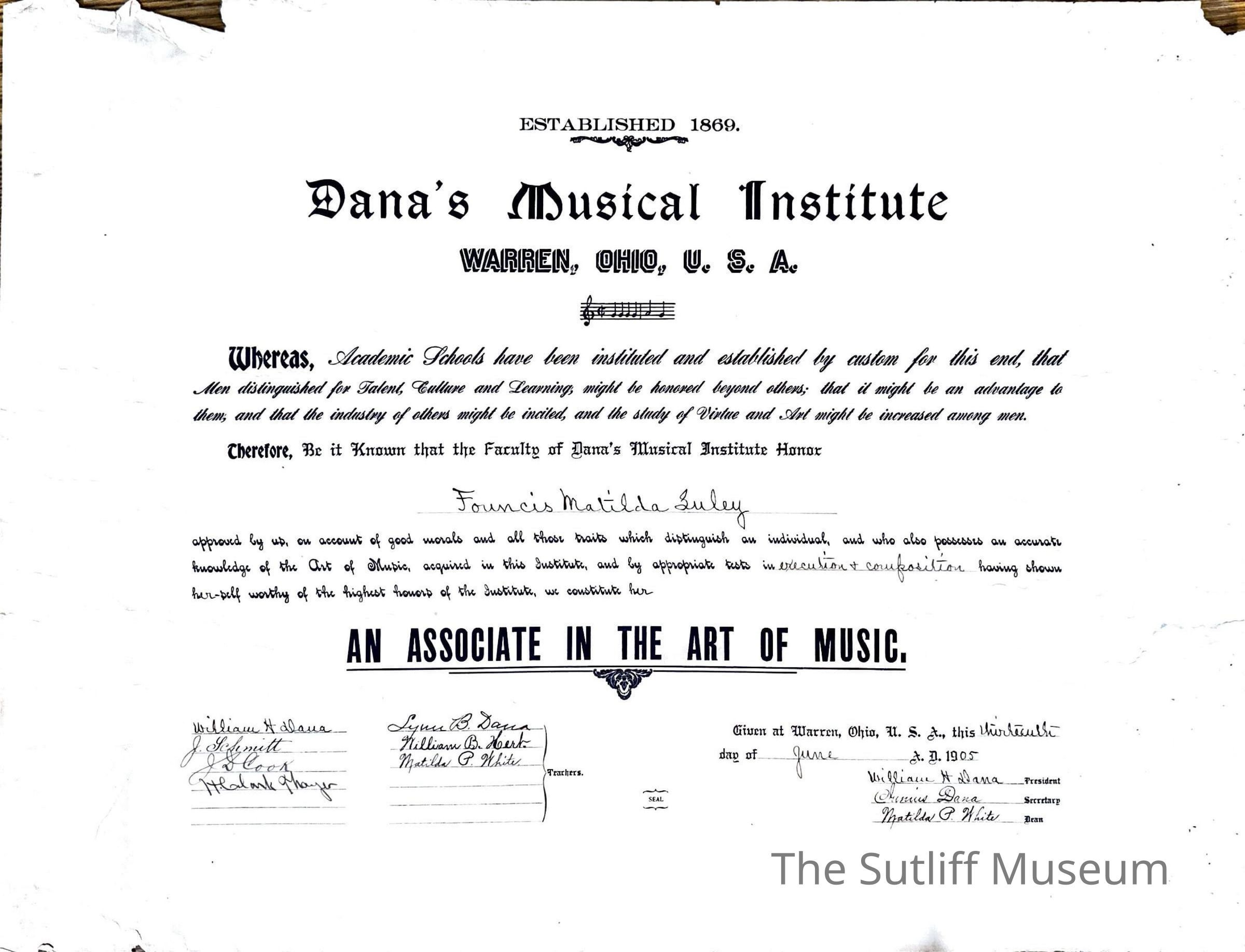 Dana's Musical Institute diploma for an Associate in the Art of Music for Founcis Matilda Luley dated June 1905.