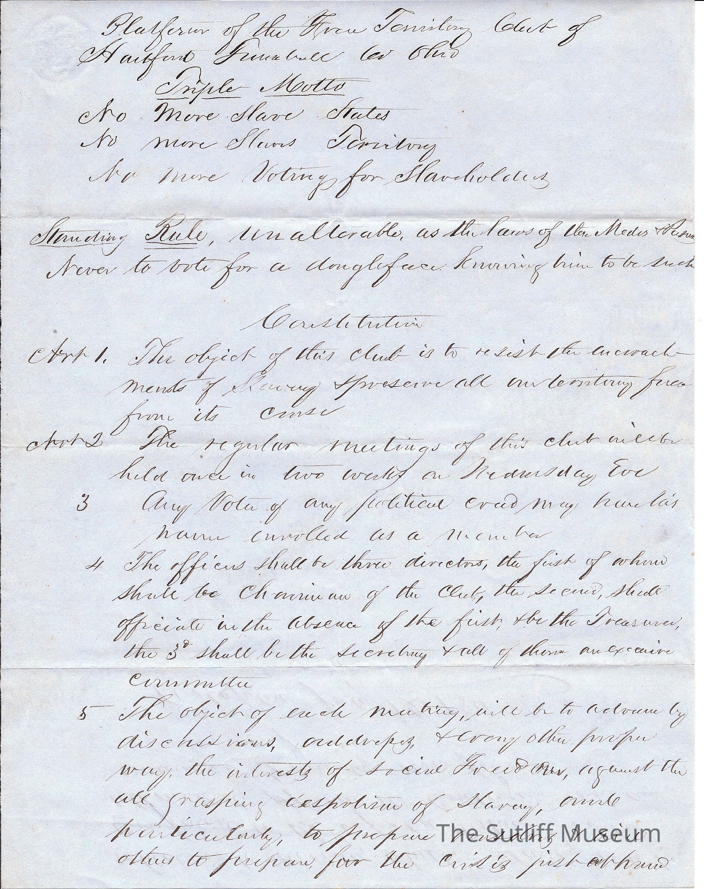 A document from the Free Territory Club of Hartford, Trumbull County acting as their constitution for the club, their rules, goals, and motto.Collection