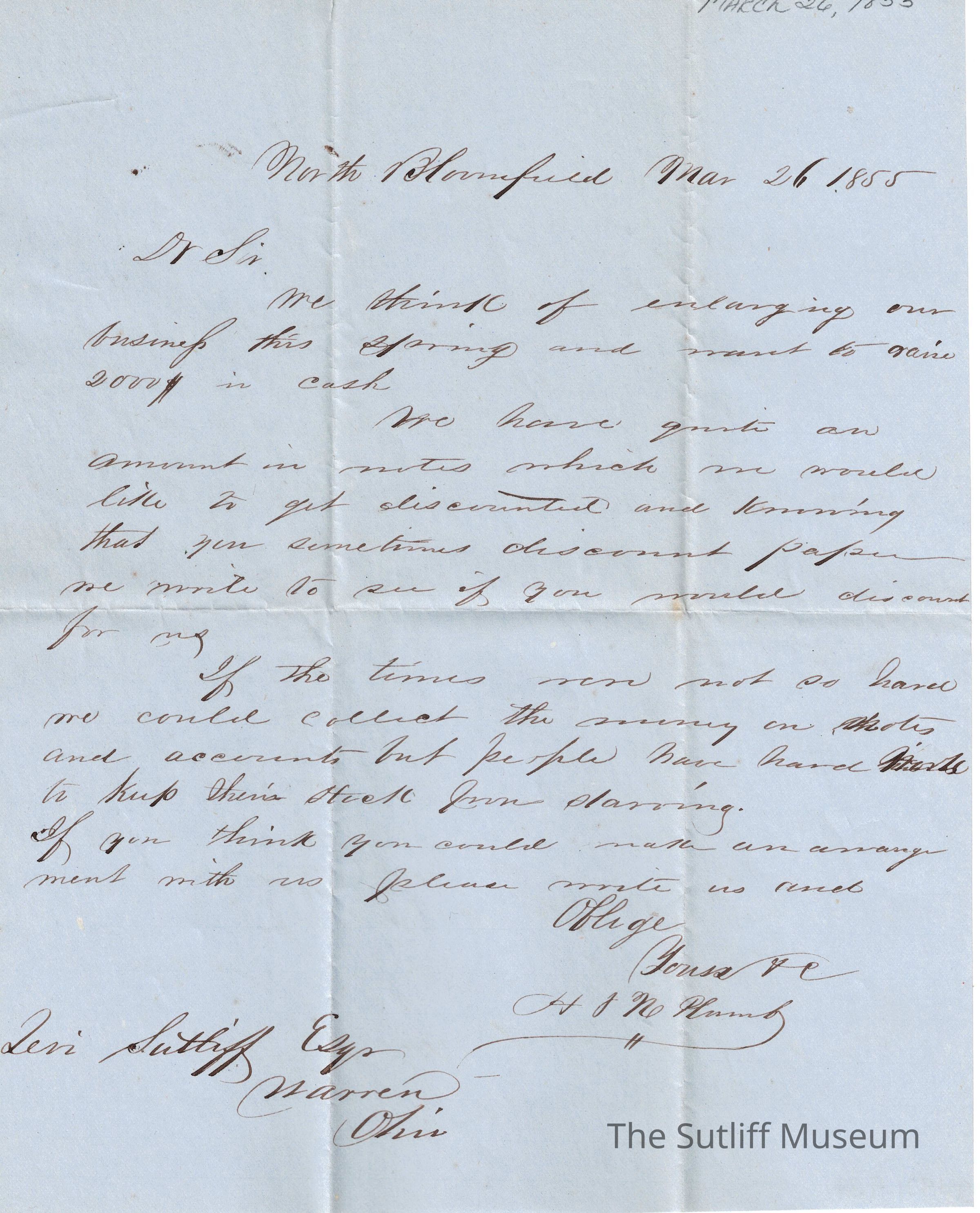 A letter from H. Plumb to Levi Sutliff regarding the expansion of his business and asking for Sutliff's assistance.Collection