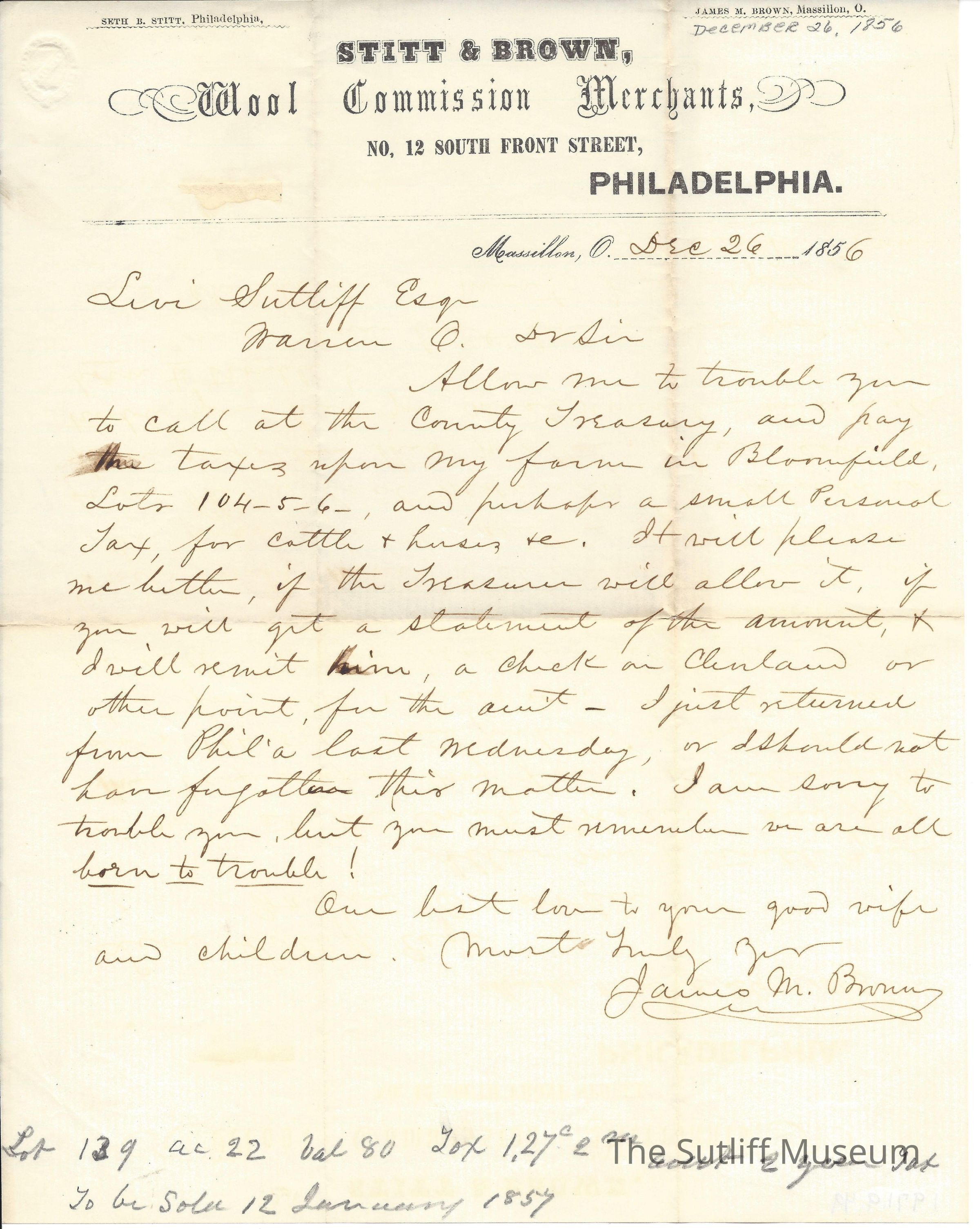 A letter from James M. Brown to Levi Sutliff regarding taxes on the farm in Bloomsfield.Collection