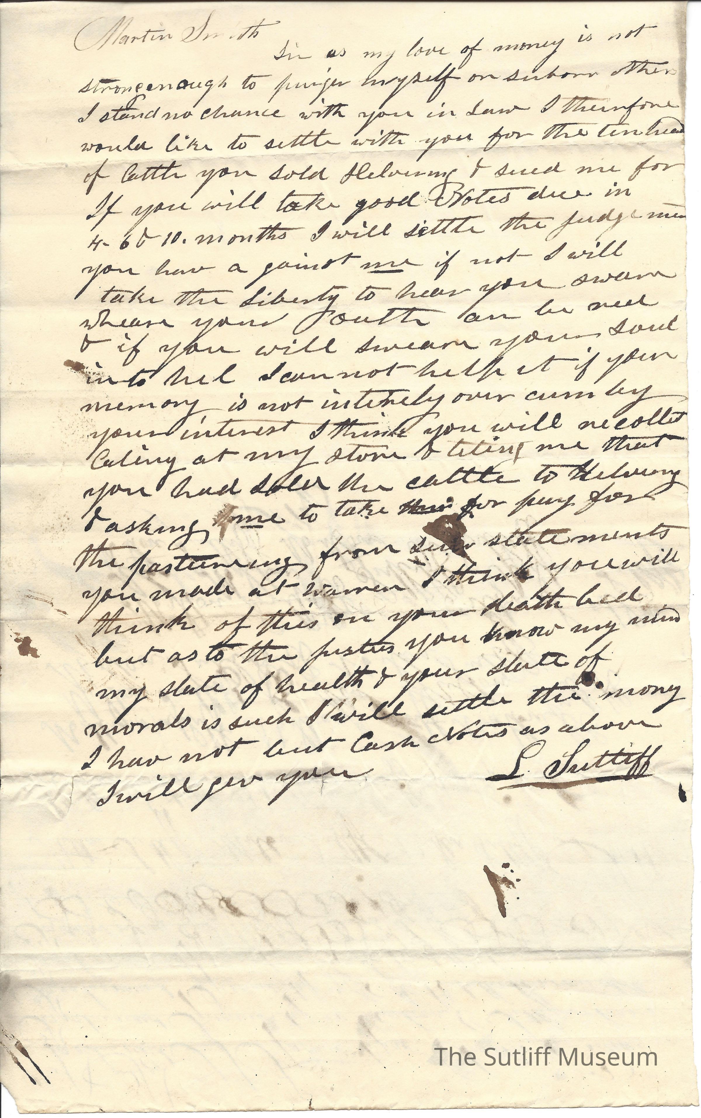 A letter from Levi Sutliff to Martin Smith regarding settlement and health.Collection