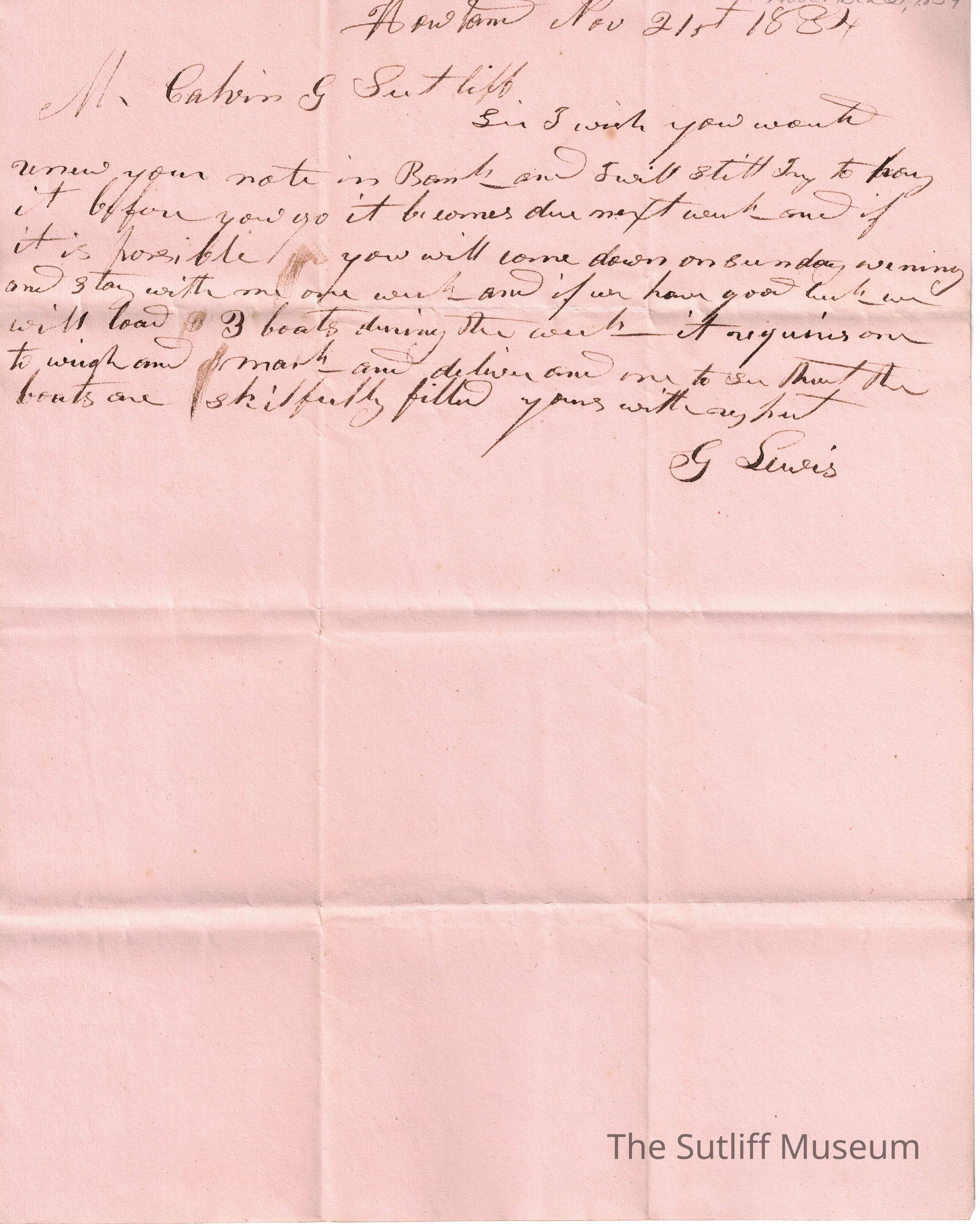A letter from Garry Lewis to Calvin Granger Sutliff regarding his intent to pay his note.Relationships