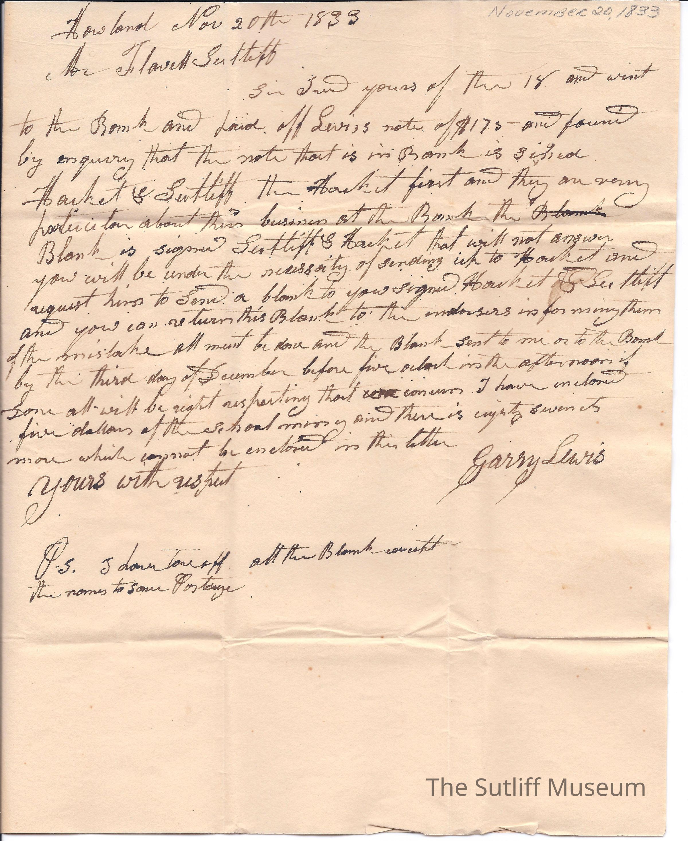 Letter from Garry Lewis to Flavel Sutliff informing him Garry has paid off Levi's note but informs Flavel he needs another signature to collect the note.