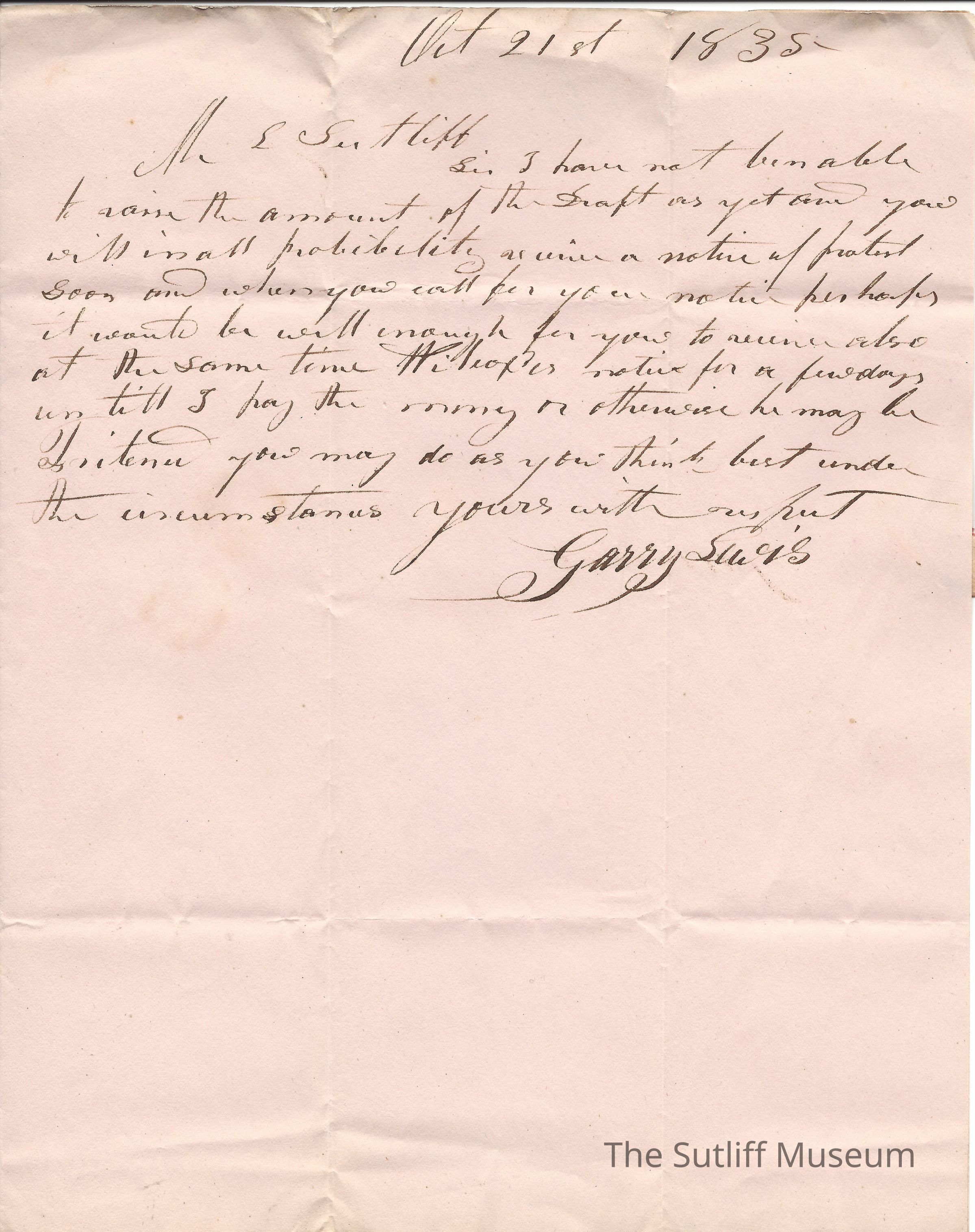 A letter from Garry Lewis to Levi Sutliff saying there might be an issue when he collects his notice, as well as Wilcox.Collection