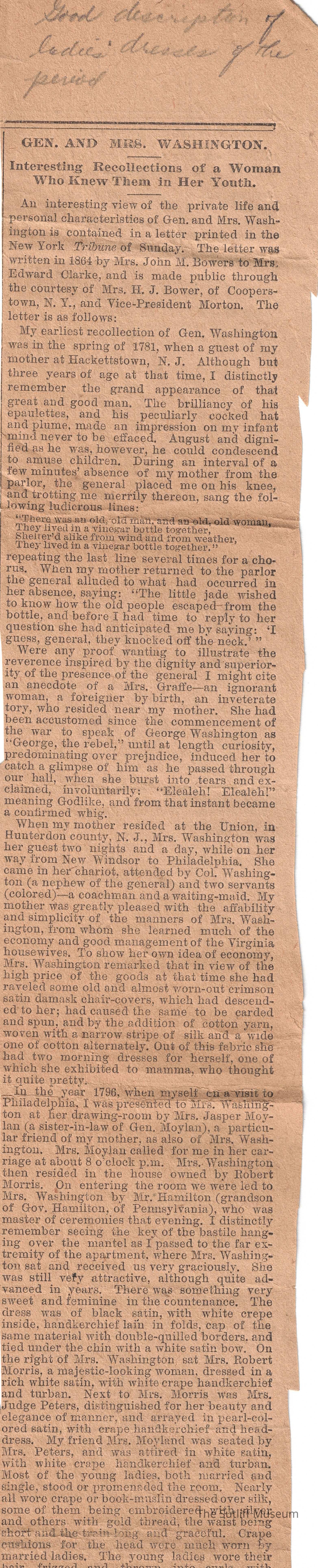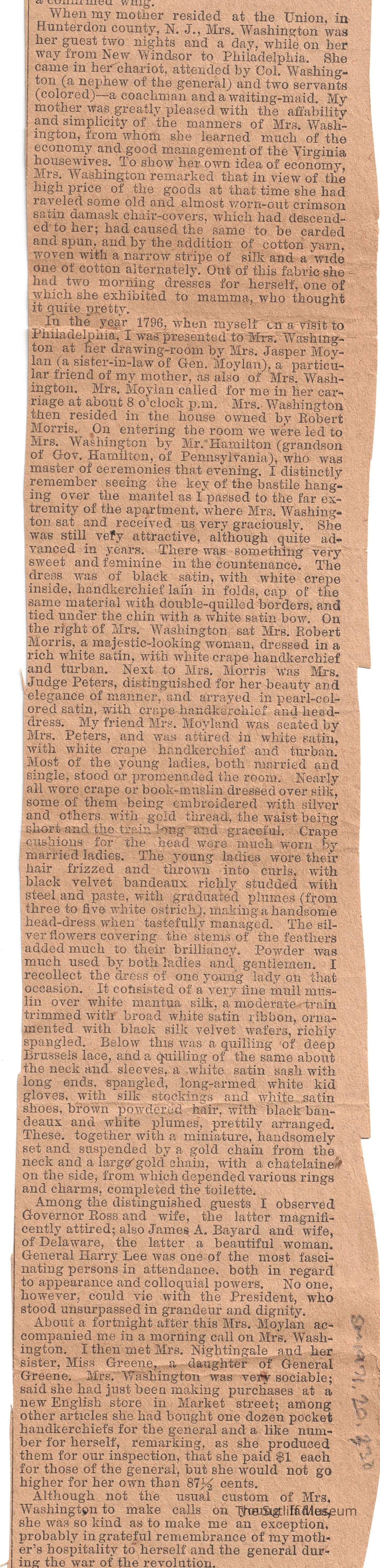 Newspaper clipping with an article about George and Martha Washington told by a woman who was close to them.Collection