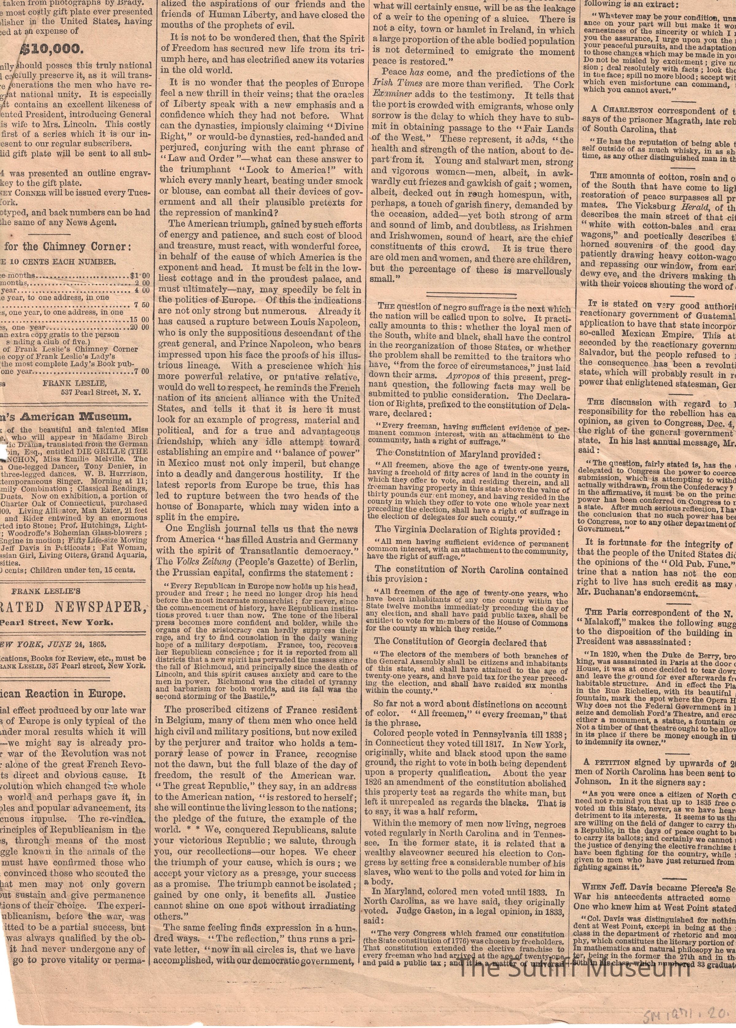 Sketched images from a newspaper titled "Appearance of General Grant on the Balcony of the Astor House", " Display of Fireworks of Clinton Hall", and "Ovation to Lieutenant General Grant At the Cooper Institute, New York, On the Evening of June 7- Grant Saluting the Audience." Undated.Collection
