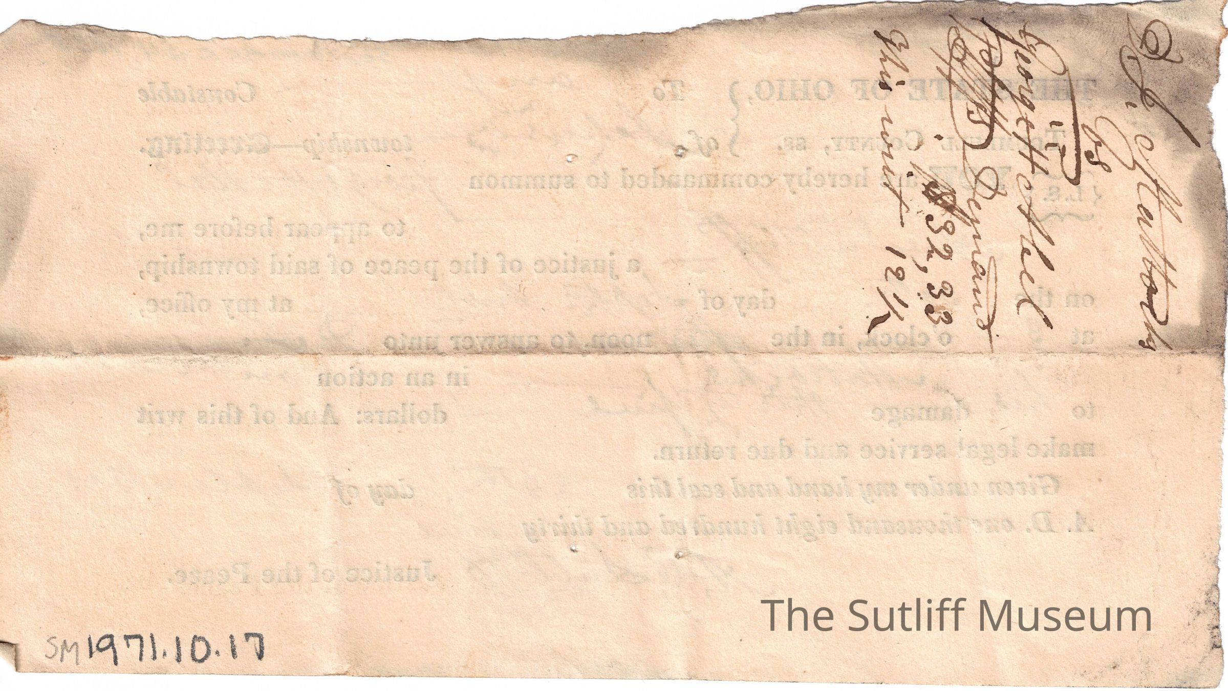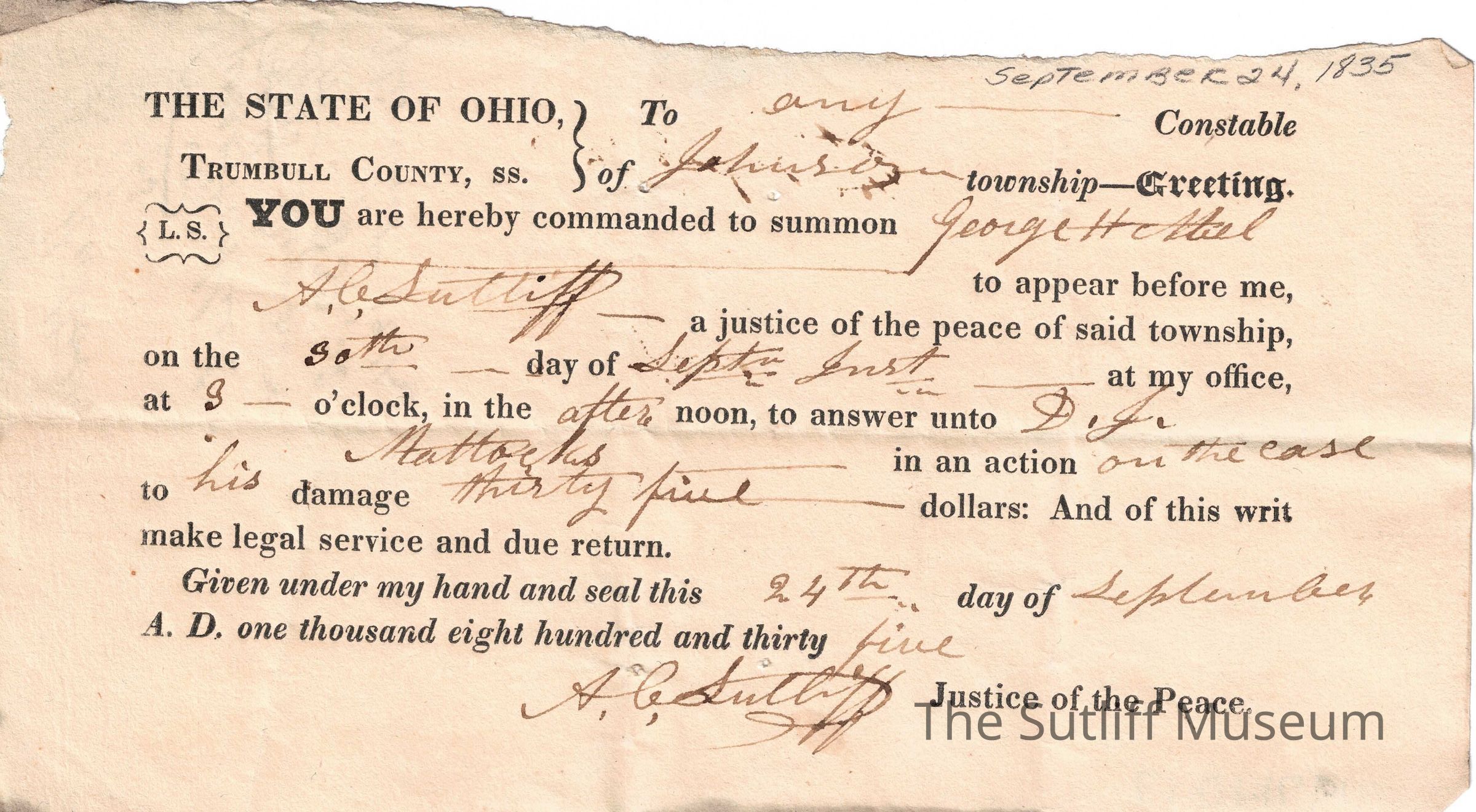 A notice from Allen Curtis Sutliff summoning on George H. Abel to appear in court.Relationships